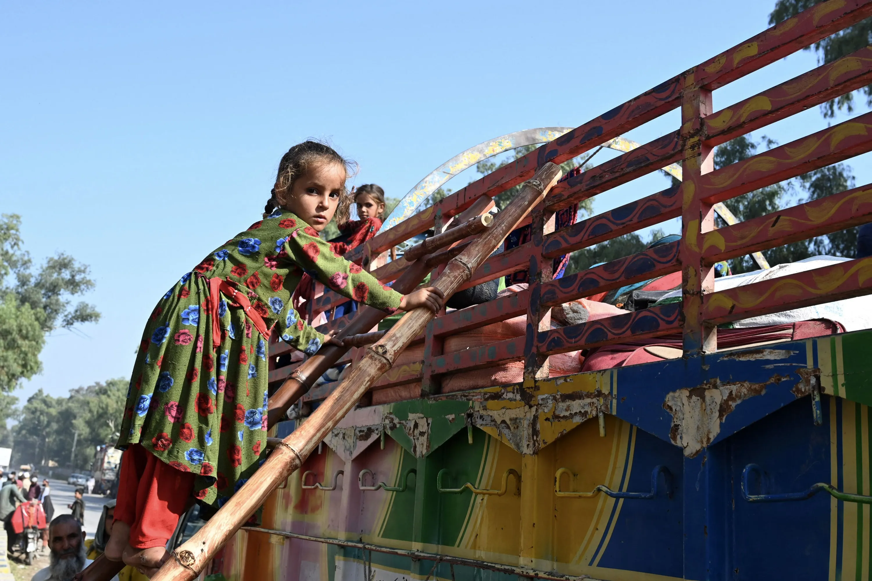 An Afghan refugee girl living in Pakistan climbs a ladder onto a truck outside the United Nations High Commissioner for Refugees (UNHCR) repatriation center, some 25 Km from Peshawar on October 25, 2023, as she returns with her family to Afghanistan following Pakistan's government decision to expel people illegally staying in the country. Hundreds of thousands of Afghans living illegally in Pakistan have been given until November 1 to leave voluntarily or face deportation, the interior minister said on October 3, a crackdown Kabul's embassy in Islamabad called “harassment”. (Photo by Abdul Majeed/AFP Photo)