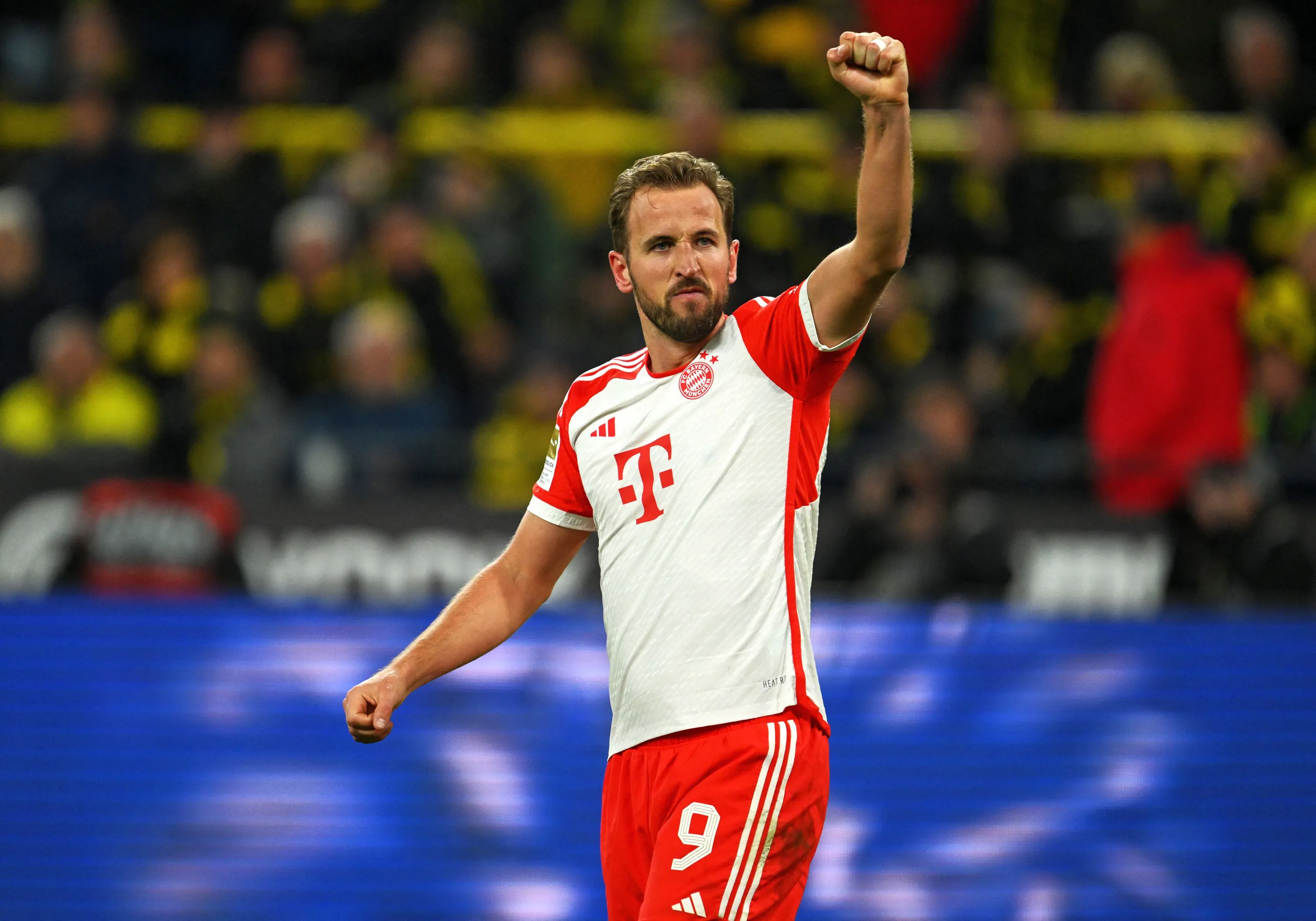 Bayern Munich's English forward #09 Harry Kane celebrates scoring the 0-3 goal during the German first division Bundesliga football match between BVB Borussia Dortmund and FC Bayern Munich in Dortmund, western Germany on November 4, 2023. (Photo by Ina Fassbender/AFP Photo)
