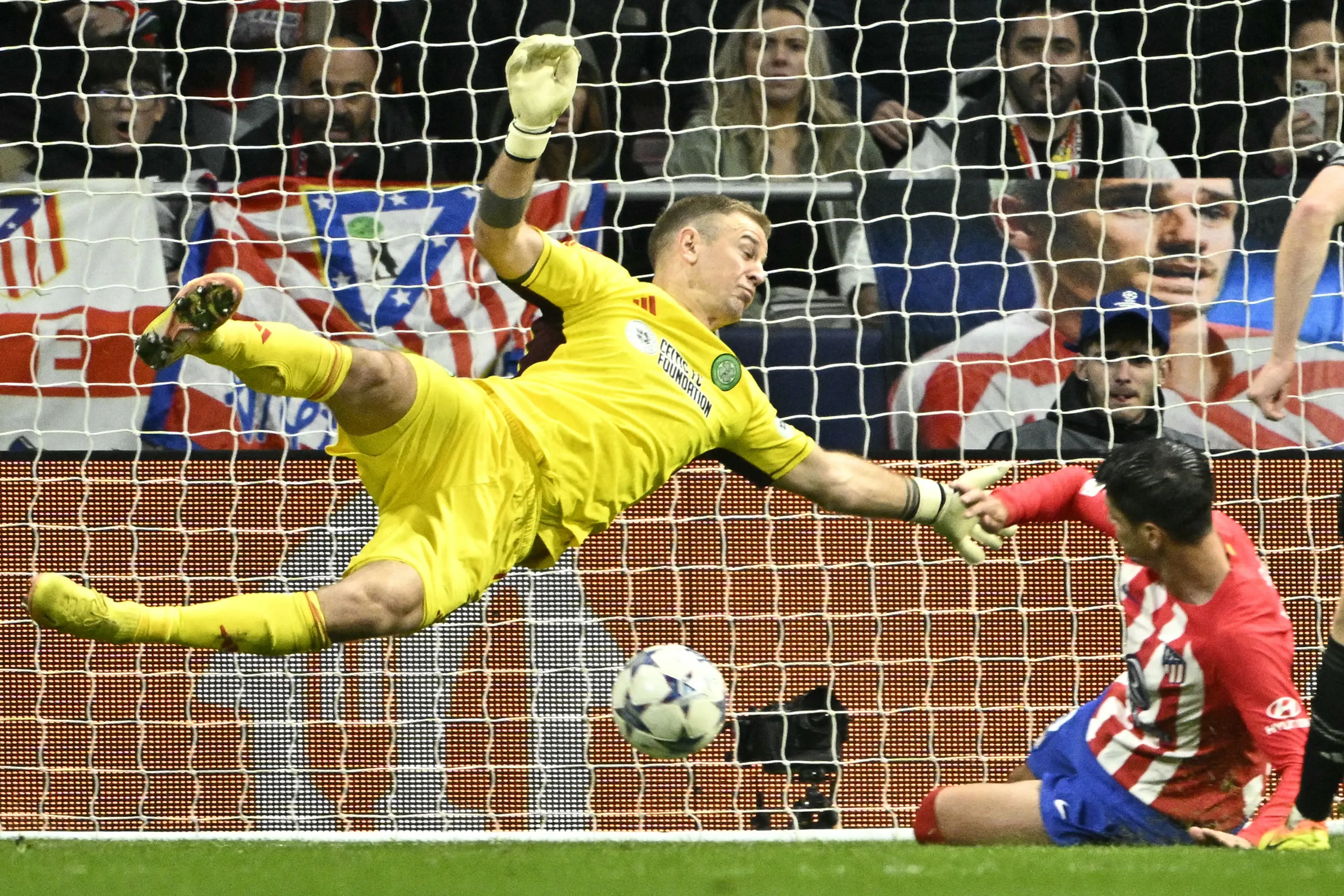Atletico Madrid's Spanish forward #19 Alvaro Morata scores his team's second goal during the UEFA Champions League group E football match between Club Atletico de Madrid and Celtic at the Metropolitano stadium in Madrid on November 7, 2023. (Photo by Javier Soriano/AFP Photo)