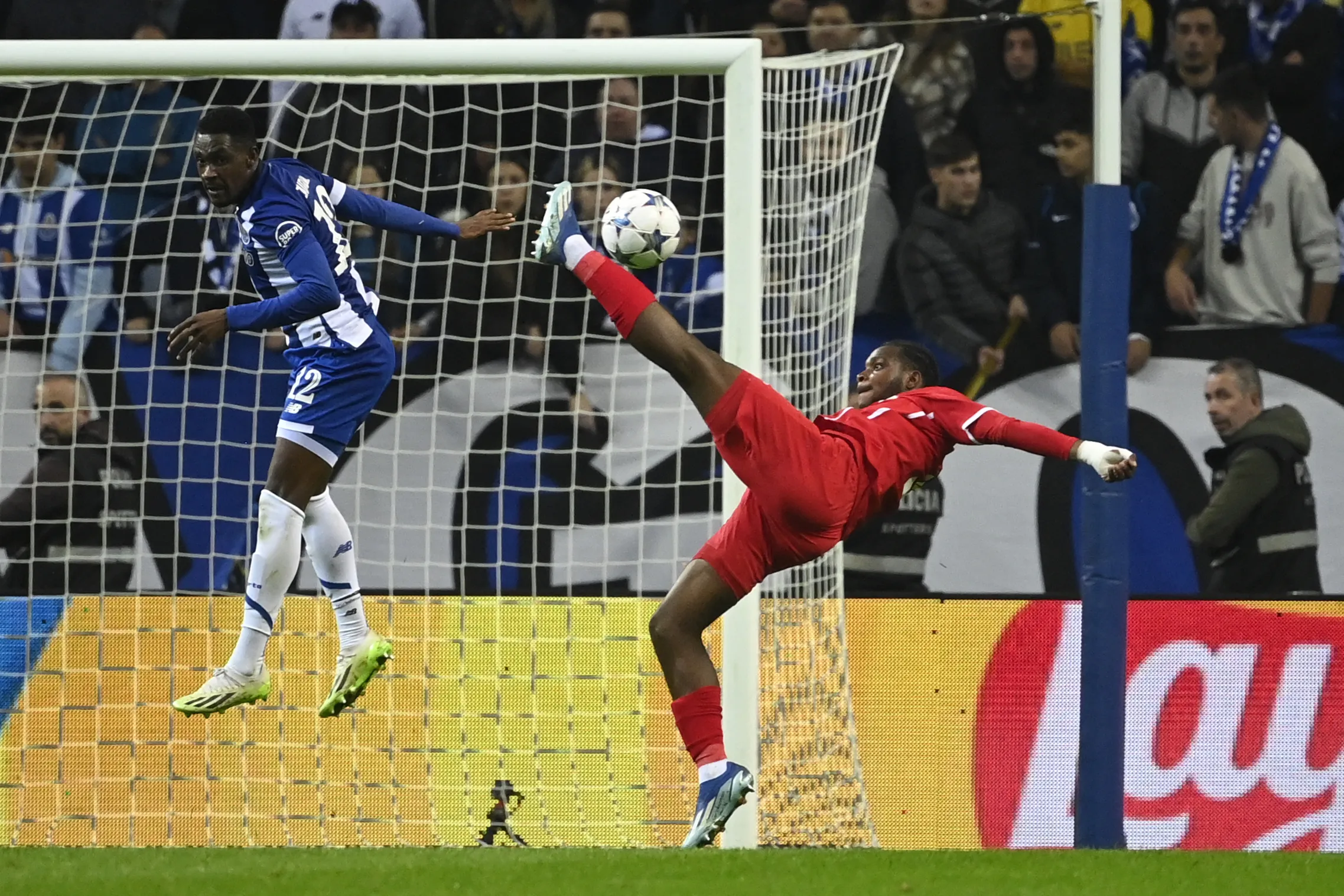 Antwerp's French forward #09 George Ilenikhena kicks the ball next to FC Porto's Nigerian defender #12 Zaidu Sanusi during the UEFA Champions League group H football match between FC Porto and Antwerp FC at the Dragao stadium in Porto on November 7, 2023. (Photo by Miguel Riopa/AFP Photo)