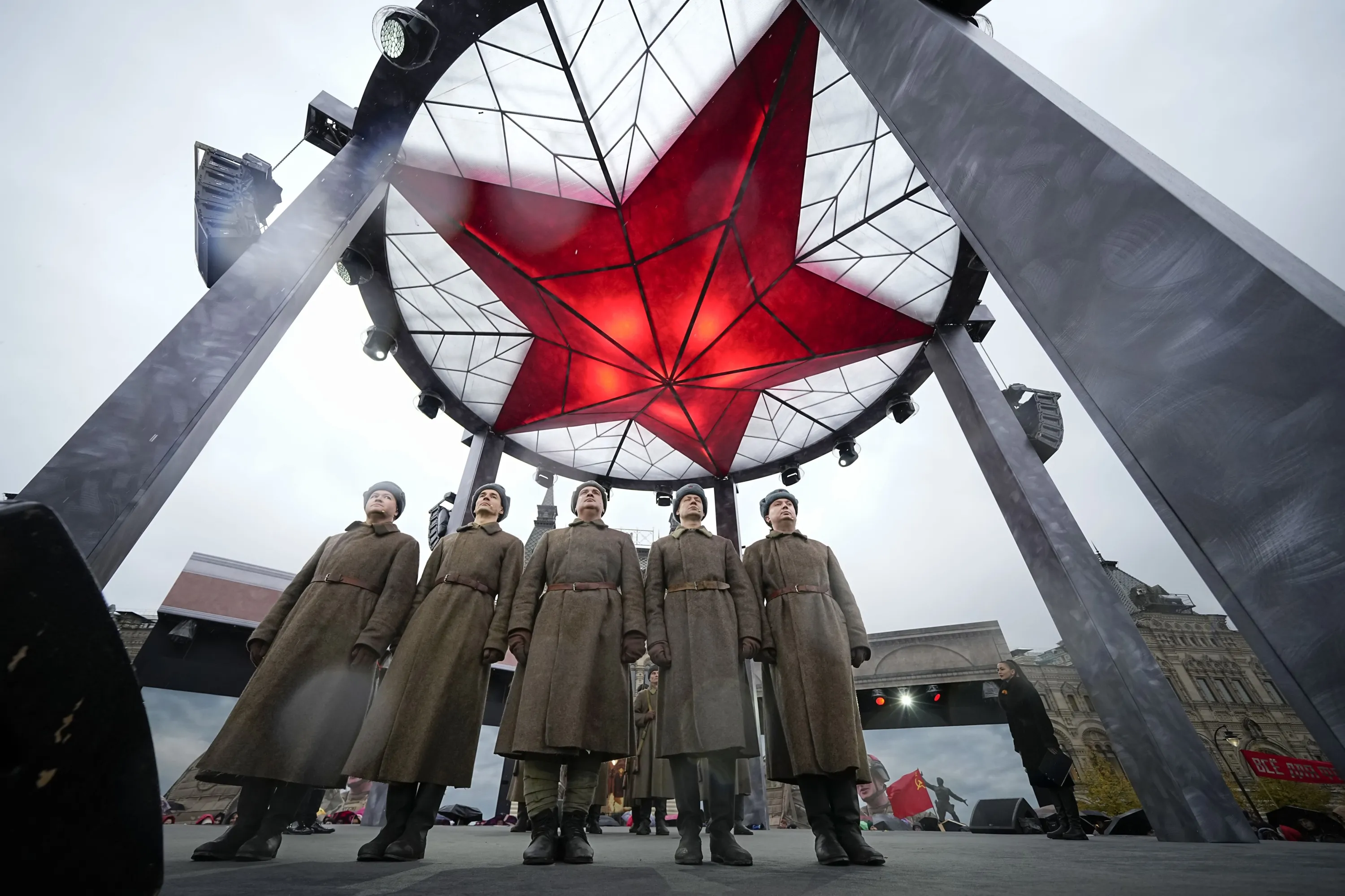Participants dressed in Red Army World War II uniforms take part in a theatrical performance at an open air interactive museum to commemorate the 82nd anniversary of the World War II-era parade, at Red Square, in Moscow, Russia, on Monday, November 6, 2023. The theatrical performance marks the 82nd anniversary of a World War II historic parade in Red Square and honored the participants in the Nov. 7, 1941 parade who headed directly to the front lines to defend Moscow from the Nazi forces. (Photo by Alexander Zemlianichenko/AP Photo)