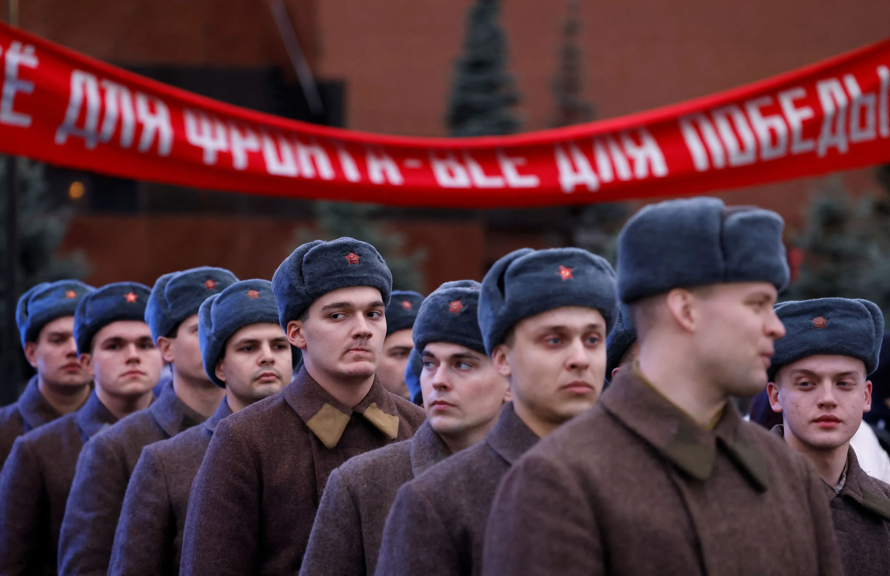 Participants line up during an exhibition marking the anniversary of a historical parade in 1941, when Soviet soldiers marched towards the front lines in the course of World War Two, in Red Square in Moscow, Russia on November 7, 2023. A slogan on a banner reads: “Everything for the front line, everything for the victory”. (Photo by Maxim Shemetov/Reuters)