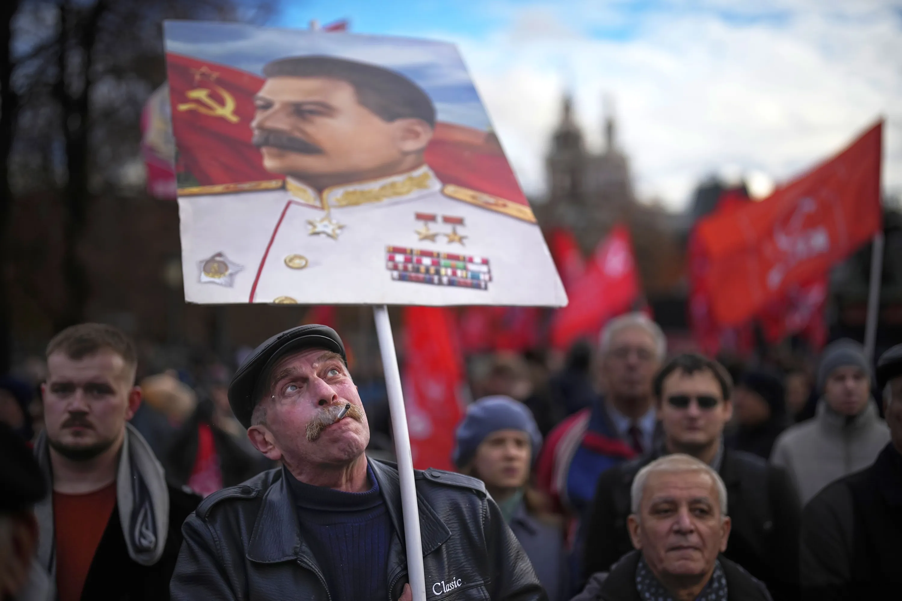 A communist party supporter holds a portrait of Soviet leader Josef Stalin during a demonstration near Red Square in Moscow, Russia, on Tuesday, November 7, 2023, as they gather to mark the 106th anniversary of the 1917 Bolshevik revolution. (Photo by Alexander Zemlianichenko/AP Photo)