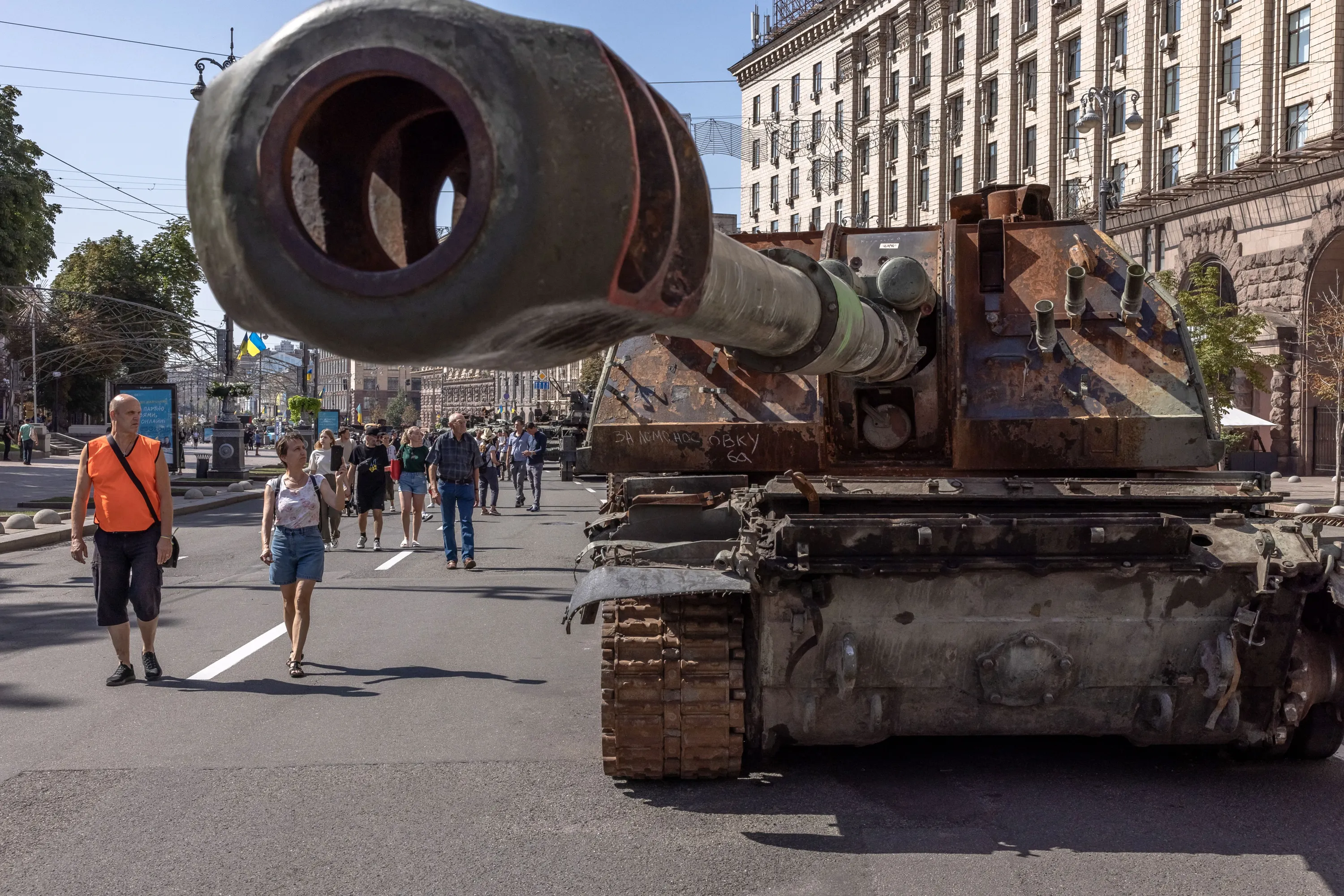 People walk past Russian armored military vehicles that were captured in fights by the Ukrainian army, displayed in Khreshchatyk street on Independence Day, in downtown Kyiv, Ukraine, 24 August 2022. Ukrainians mark the 31st anniversary of Ukraine's independence from the Soviet Union in 1991, as the Russian invasion continues six months since its beginning. Russian troops on 24 February entered Ukrainian territory, starting the conflict that has provoked destruction and a humanitarian crisis. (Photo by Roman Pilipey/EPA/EFE)