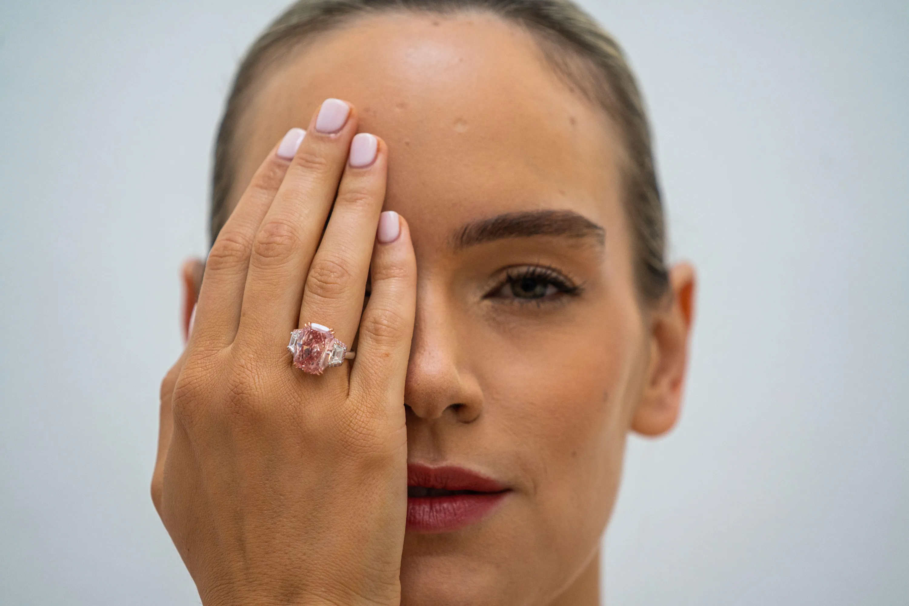 Nina a Sotheby's model wears The Willimason Pink star, an 11.15 carats and one of the rarest pink diamonds which is estimated at US 21 Million in London on August 31, 2022. The sale will take place in Hong Kong in October (Photo by Amer Ghazzal/Alamy Live News)