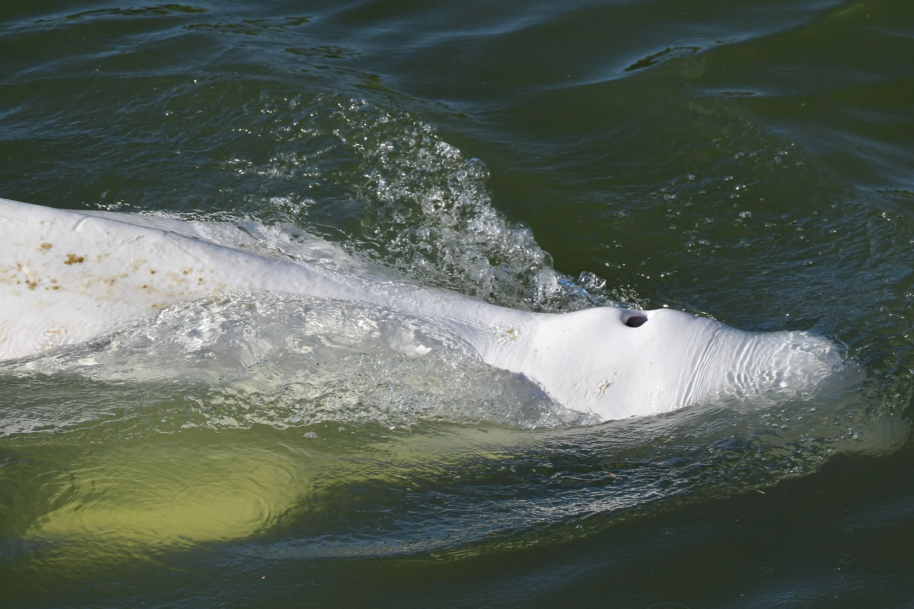 A beluga whale is seen swimming up France's Seine river, near a lock in Courcelles-sur-Seine, western France on August 5, 2022. The beluga whale appears to be underweight and officials are worried about its health, regional authorities said. The protected species, usually found in cold Arctic waters, had made its way up the waterway and reached a lock some 70 kilometres (44 miles) from Paris. The whale was first spotted on August 2, 2022 in the river that flows through the French capital to the English Channel, and follows the rare appearance of a killer whale in the Seine just over two months ago. (Photo by Jean-François Monier/AFP Photo)