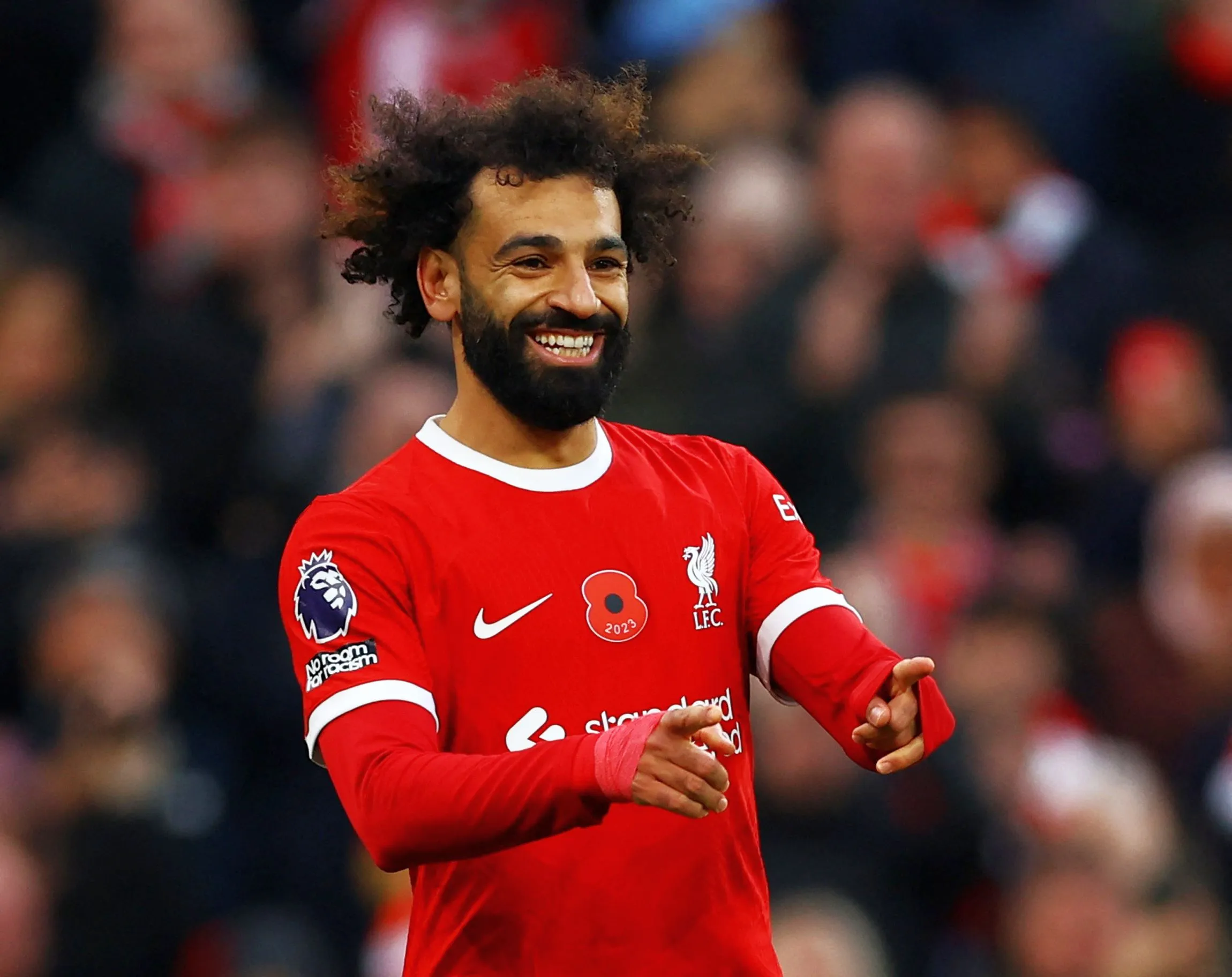 Liverpool's Mohamed Salah celebrates scoring their side's first goal of the game during the Premier League match at Anfield, Liverpool on Sunday, November 12, 2023. (Photo by Molly Darlington/Reuters)