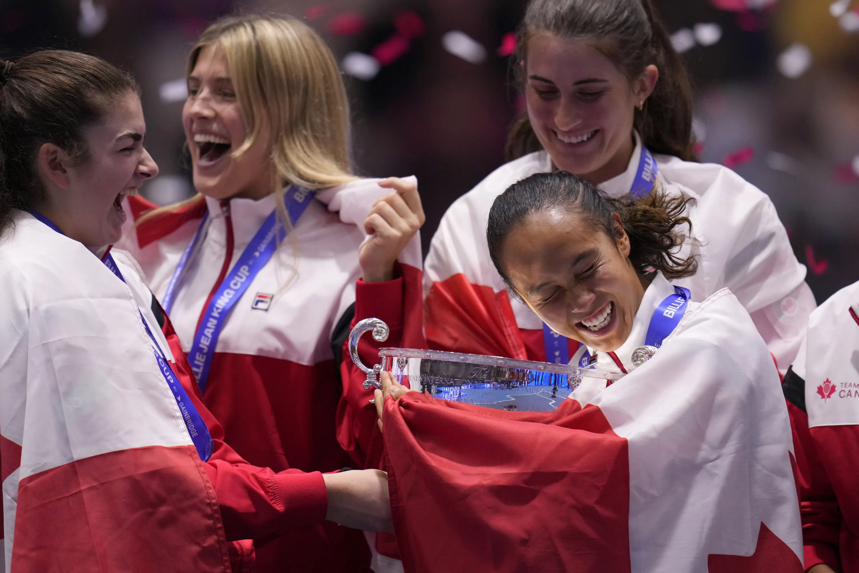Canada's Leylah Fernandez, right, holds the trophy with member of her team after wining the final singles tennis match against Italy's Jasmine Paolini, during the Billie Jean King Cup finals in La Cartuja stadium in Seville, southern Spain, Spain, Sunday, November 12, 2023. (Photo by Manu Fernandez/AP Photo)