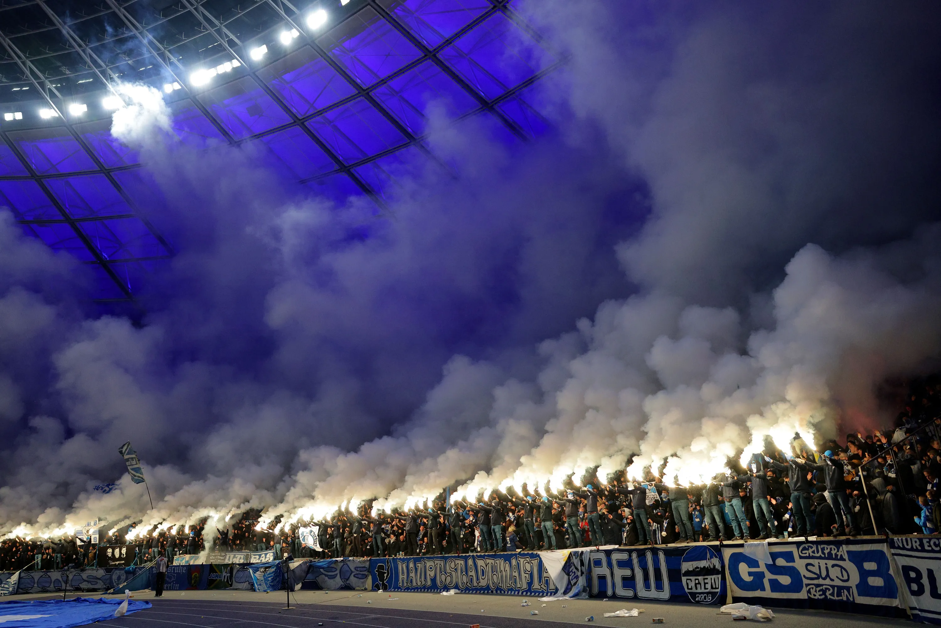 Fans of Hertha Berlin light flares in the stands during the Second Bundesliga match between Hertha BSC and Karlsruher SC at Olympiastadion on November 11, 2023 in Berlin, Germany. (Photo by Maja Hitij/Getty Images)