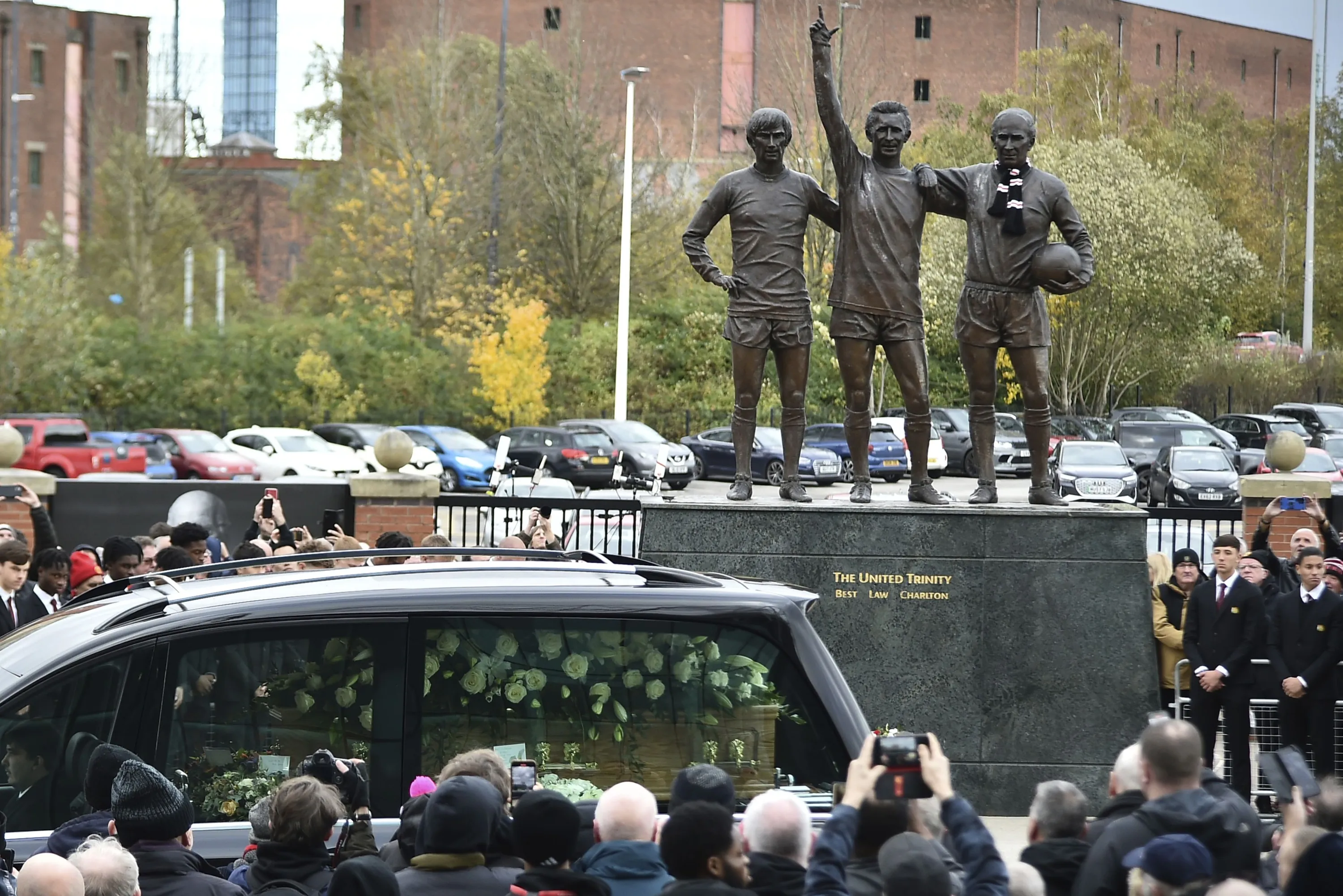 The cortege of English soccer icon Bobby Charlton passes by the statue of Manchester United trio of George Best, left, Denis Law, center, and Sir Bobby Charlton outside Old Trafford stadium on its way to the funeral service at Manchester Cathedral in Manchester, England, Monday, November 13, 2023. Charlton who played largely for Manchester United survived a plane crash that decimated a United team destined for greatness, he went on to became the heartbeat of his country's 1966 World Cup triumph. (Photo by Rui Vieira/AP Photo)