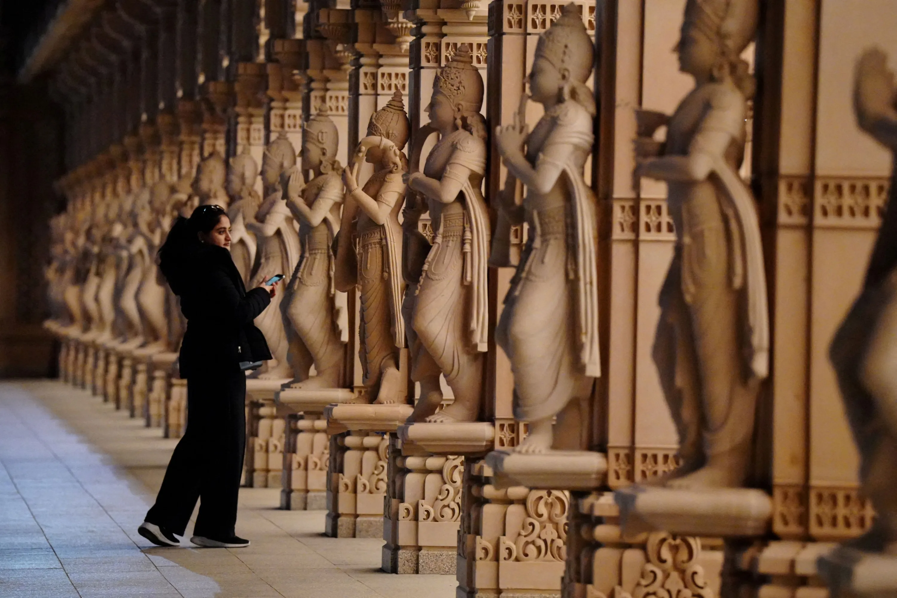 A woman with a mobile phone gazes at pink sandstone statues during celebrations for Diwali, the Hindu festival of lights, at Akshardham Mahamandir temple in Robbinsville, New Jersey, U.S., November 12, 2023. (Photo by Bing Guan/Reuters)
