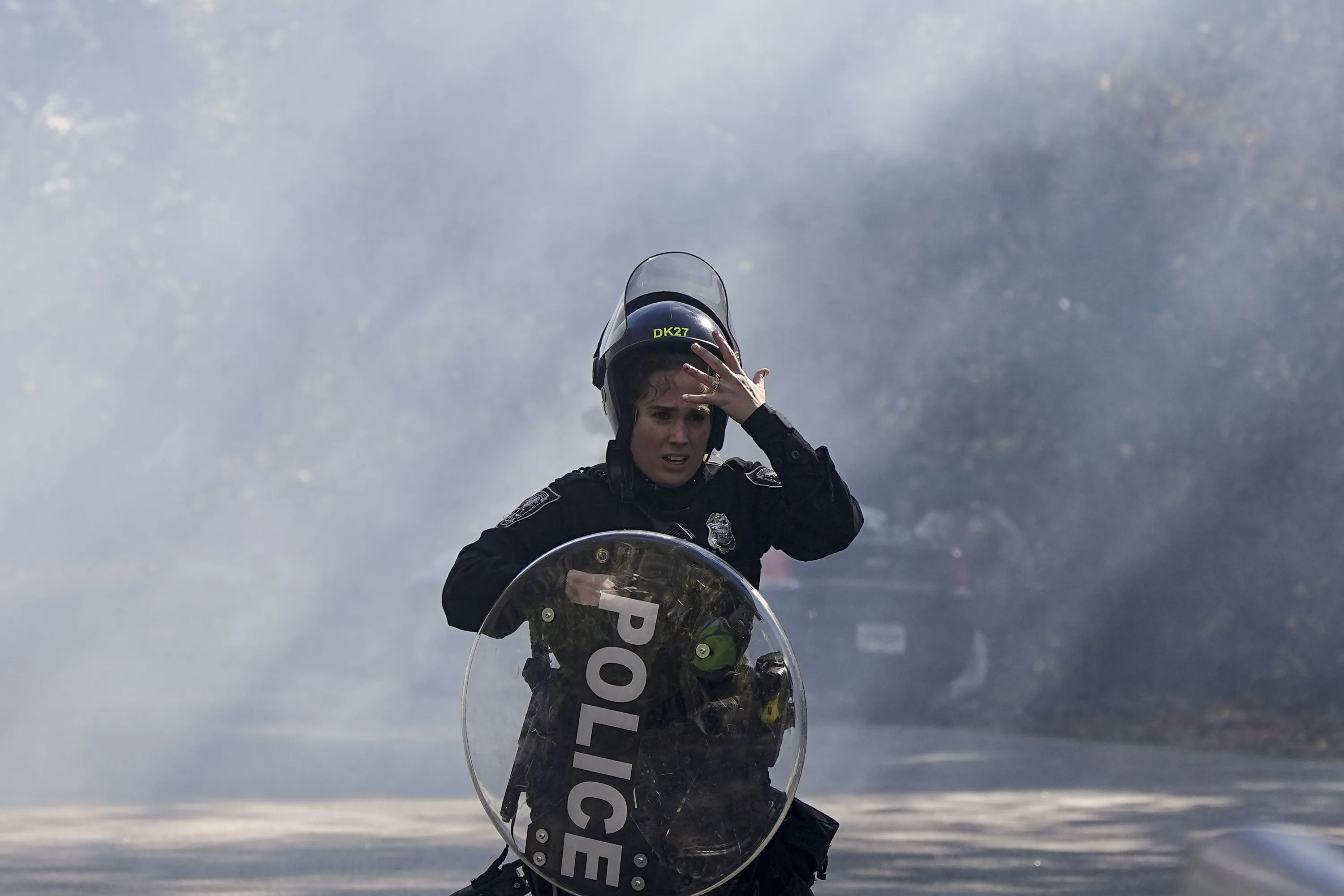 A police officer runs out of a cloud of gas during a demonstration in opposition to a new police training center, Monday, November 13, 2023, in Atlanta. (Photo by Mike Stewart/AP Photo)