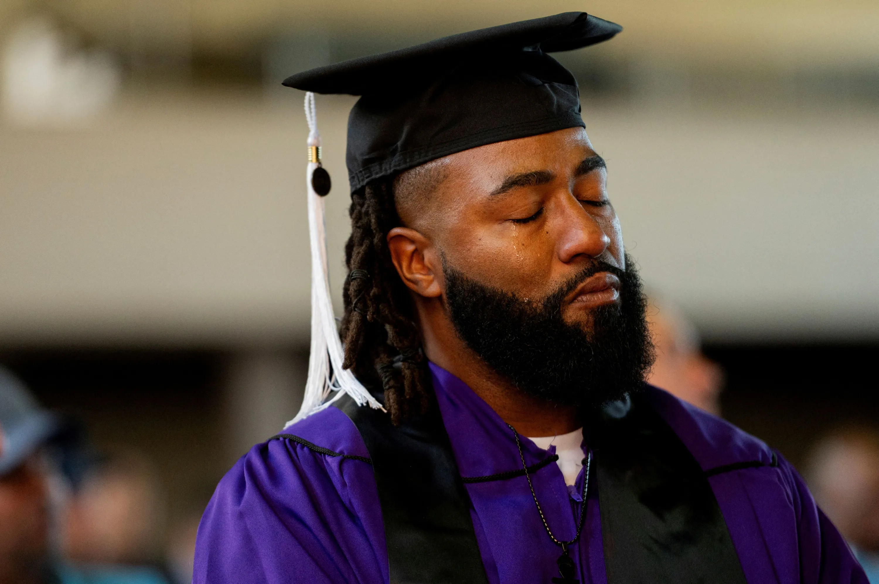 A prisoner sheds a tear before receiving his bachelor's degree from Northwestern University during a graduation ceremony for students who went through the inaugural class of the Northwestern Prison Education Program at Stateville Correctional Center in Crest Hill, Illinois, U.S., November 15, 2023. (Photo by Vincent Alban/Reuters)