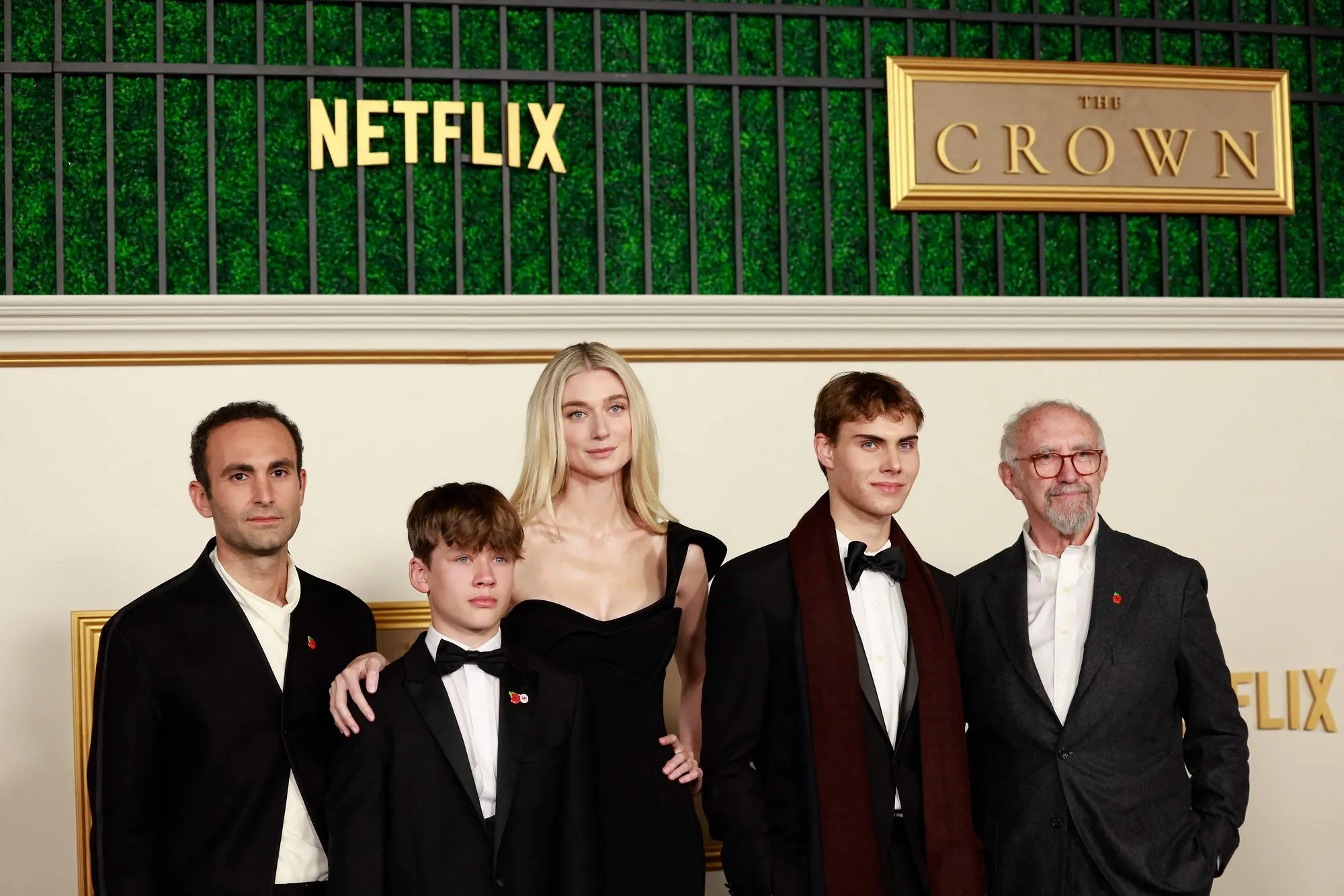 (From L) Cast members Khalid Abdalla, Fflyn Edwards, Elizabeth Debicki, Rufus Kampa and Jonathan Pryce arrive for the Los Angeles of Netflix's “The Crown”, Season 6 Part 1, at Westwood Regency Village Theatre on November 12, 2023 in Los Angeles. (Photo by Michael Tran/AFP Photo)