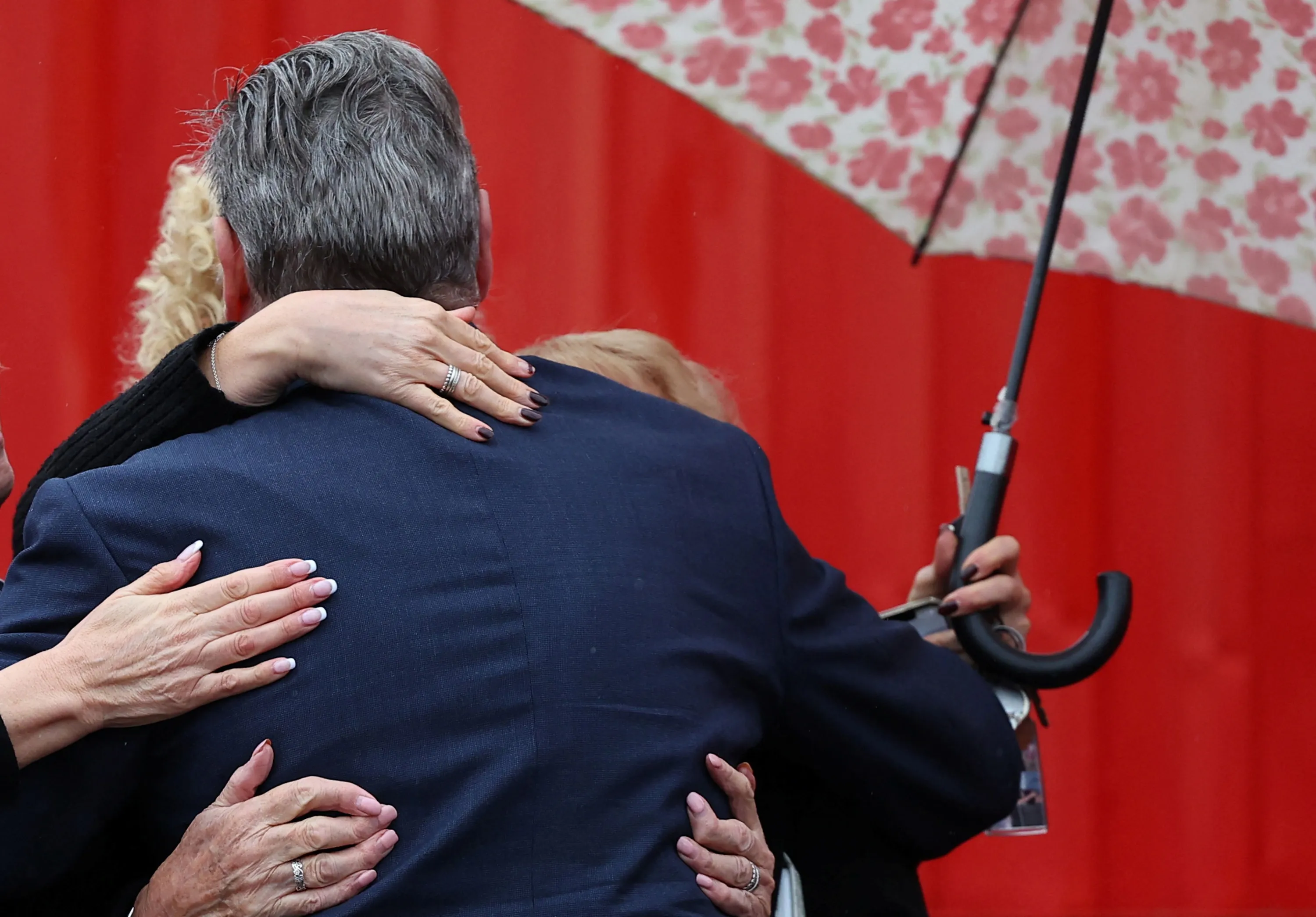 Well-wishers embrace Kier Starmer, leader of Britain's Labour Party, as he attends a by-election victory event for Sarah Edwards, newly elected MP for Tamworth, at Tamworth football stadium, Tamworth in central Britain on October 20, 2023. (Photo by Toby Melville/Reuters)