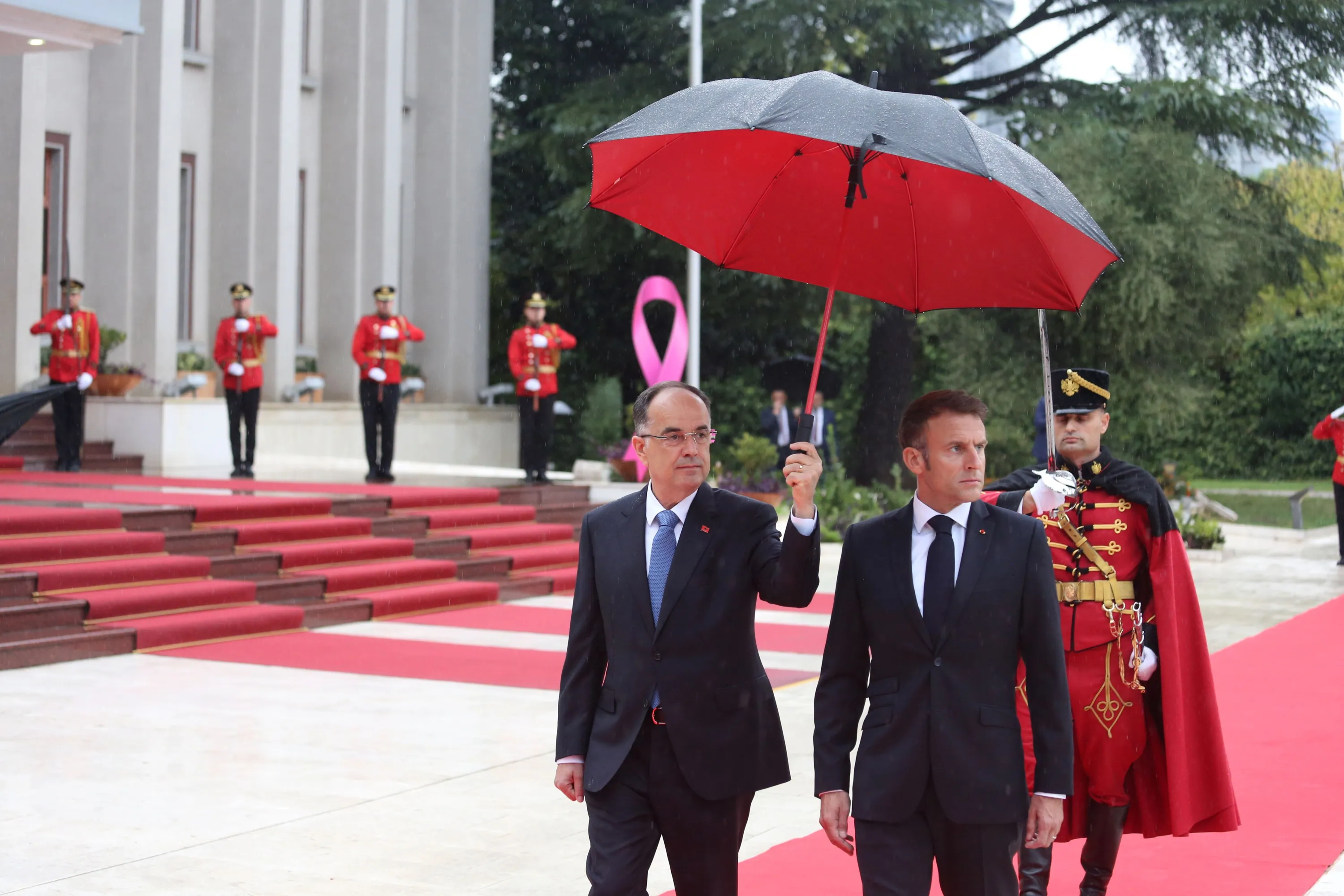 Albania's President Bajram Begaj (L) holds an umbrella during the inspection of the honor guard with French President Emmanuel Macron (R) ahead of their meeting in Tirana, Albania, 17 October 2023. French President Macron is on an official visit to Albania. (Photo by Malton Dibra/EPA)