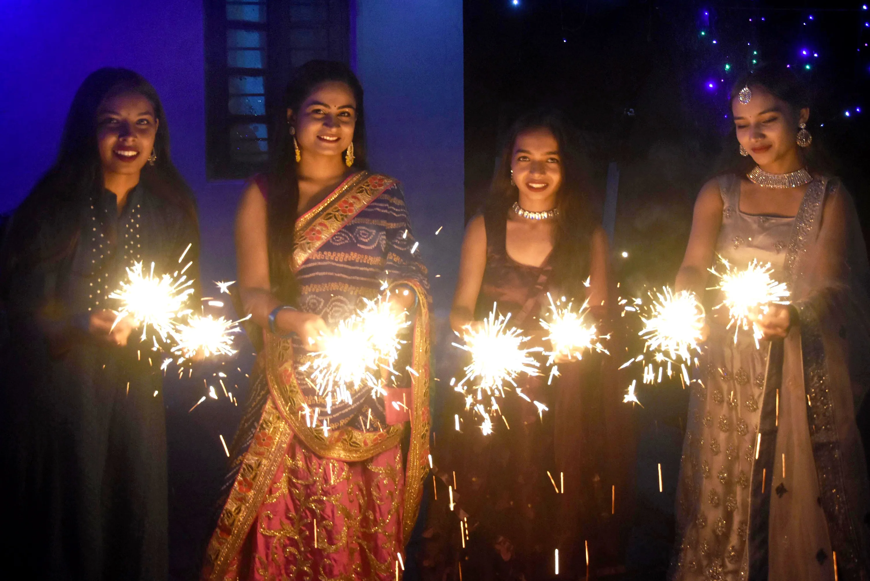Women play with firecrackers as they celebrate Diwali festival, also known as festival of lights, in Bhopal, India, November 11, 2023. (Photo by Xinhua News Agency/Rex Features/Shutterstock)