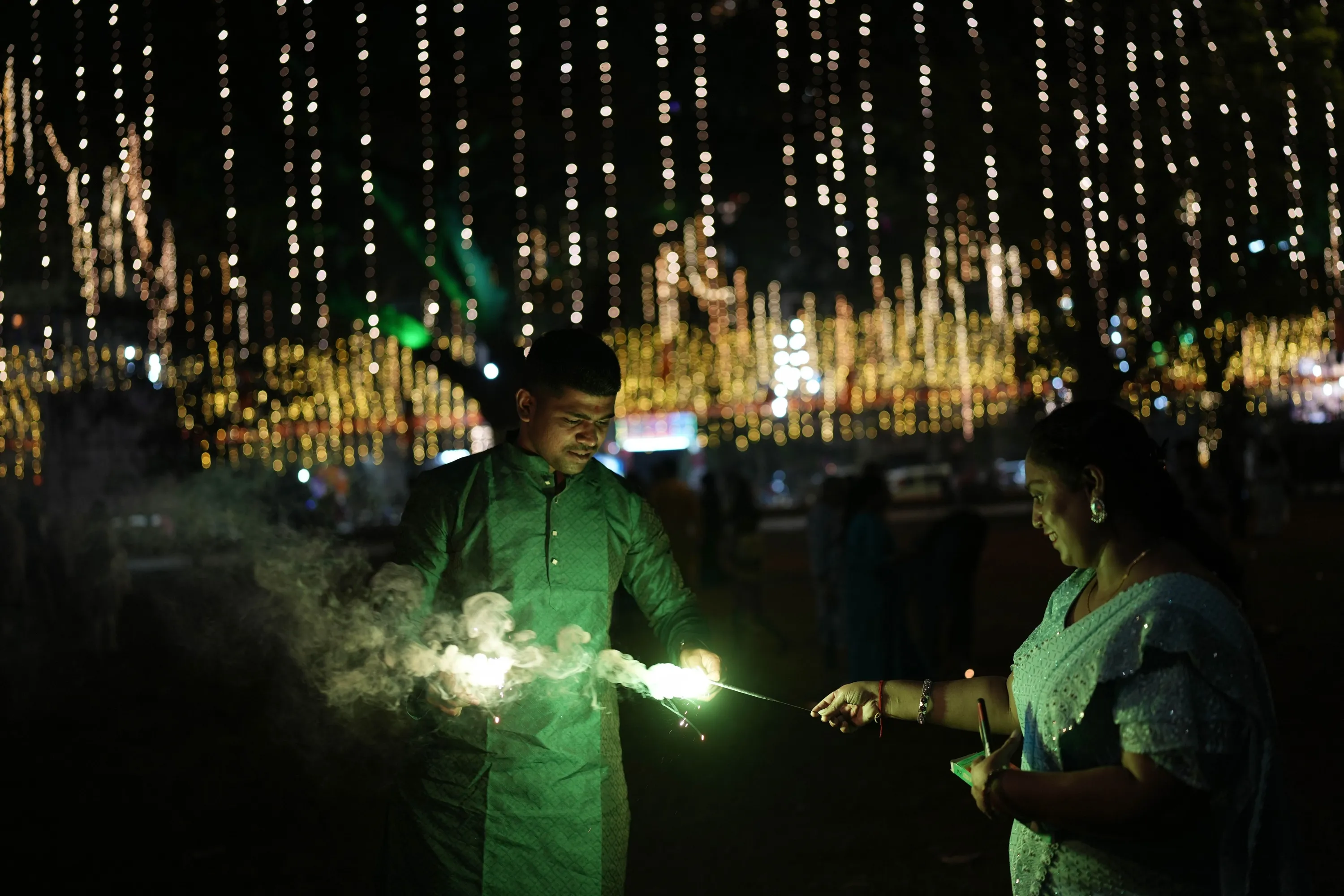 People light fire crackers during festival of lights Diwali in Mumbai, India, Sunday, November 12, 2023. (Photo by Rajanish Kakade/AP Photo)