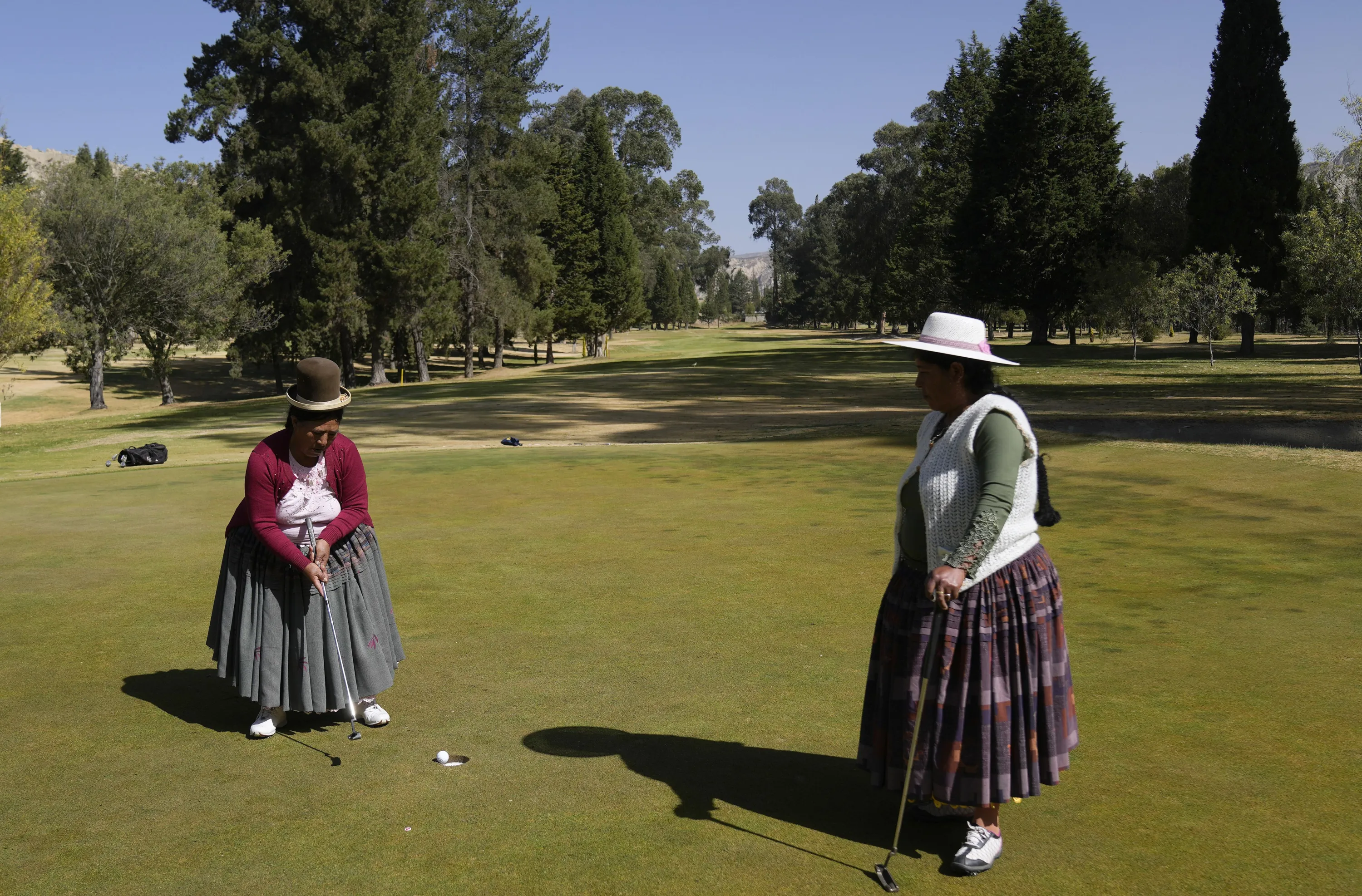 Aymara Indigenous women, Teresa Zarate, left, putts the ball while Martha Mamani watches her during the workers' tournament at the La Paz Golf Club of Mallasilla on the outskirts of La Paz, Bolivia, Monday, August 1, 2022. (Photo by Juan Karita/AP Photo)