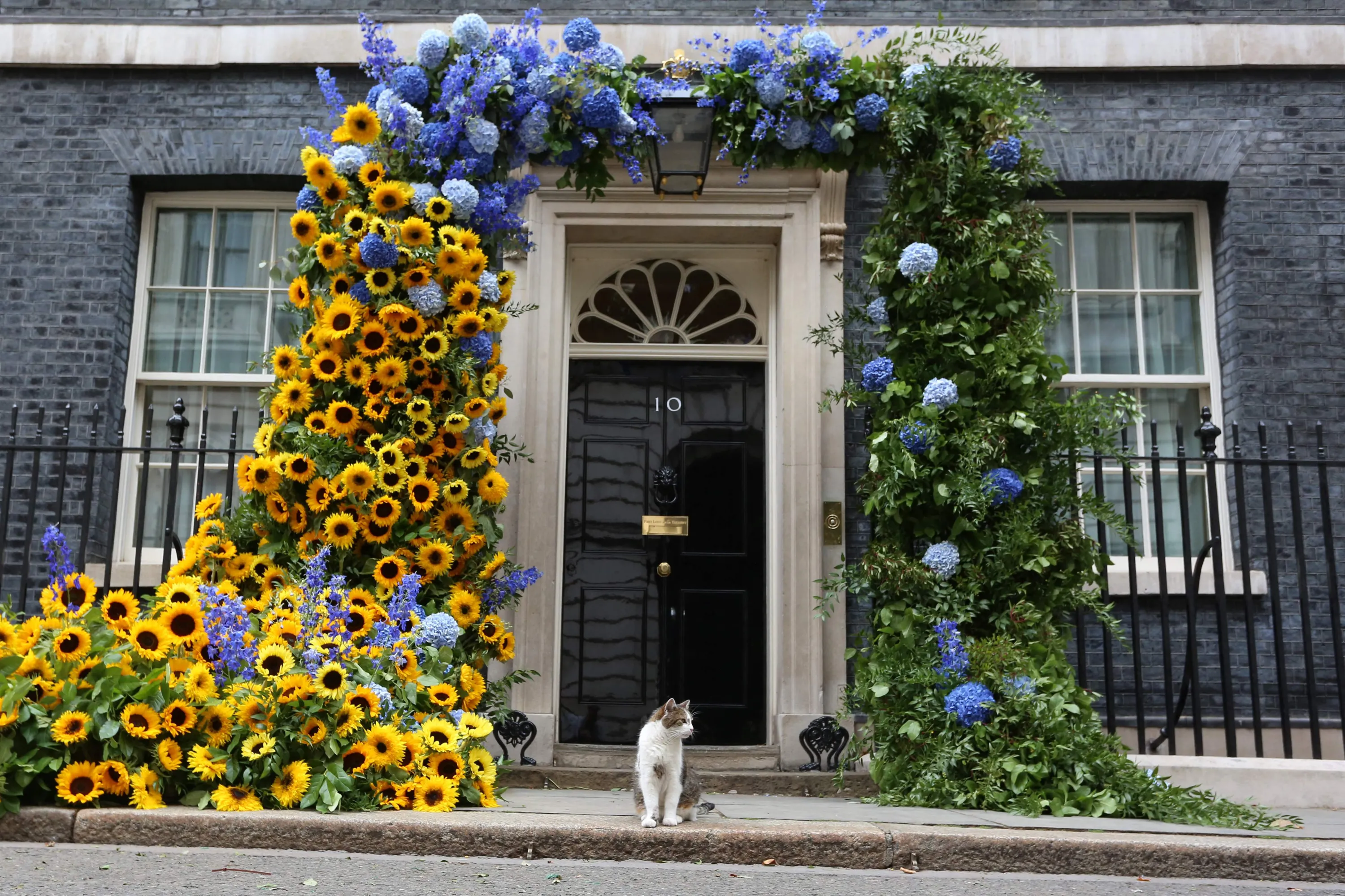 Larry the cat stands by a flower arch of Ukraine's national flower, sunflowers, erected outside Number 10 Downing Street in London to mark Ukrainian Independence Day on August 24, 2022. (Photo by Susannah Ireland/AFP Photo)