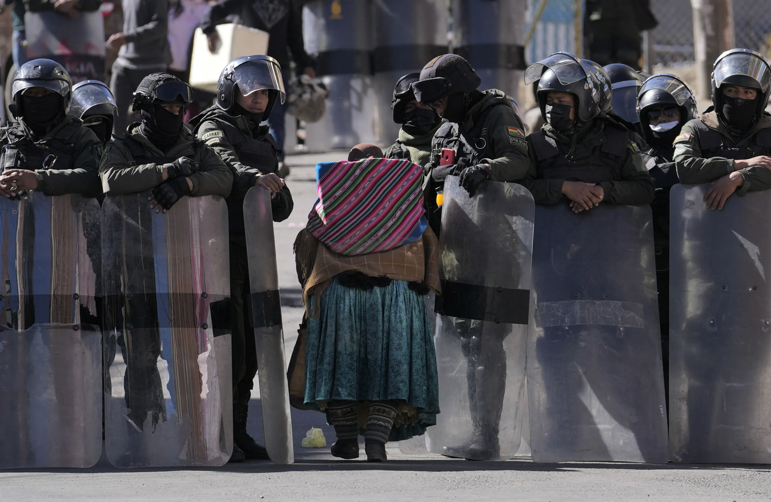 Police make way for an elderly woman to pass through while guarding the new coca leaf market during the third day of clashes in La Paz, Bolivia, Wednesday, August 3, 2022. Anti-government coca farmers are protesting against a parallel coca leaf market in La Paz. (Photo by Juan Karita/AP Photo)