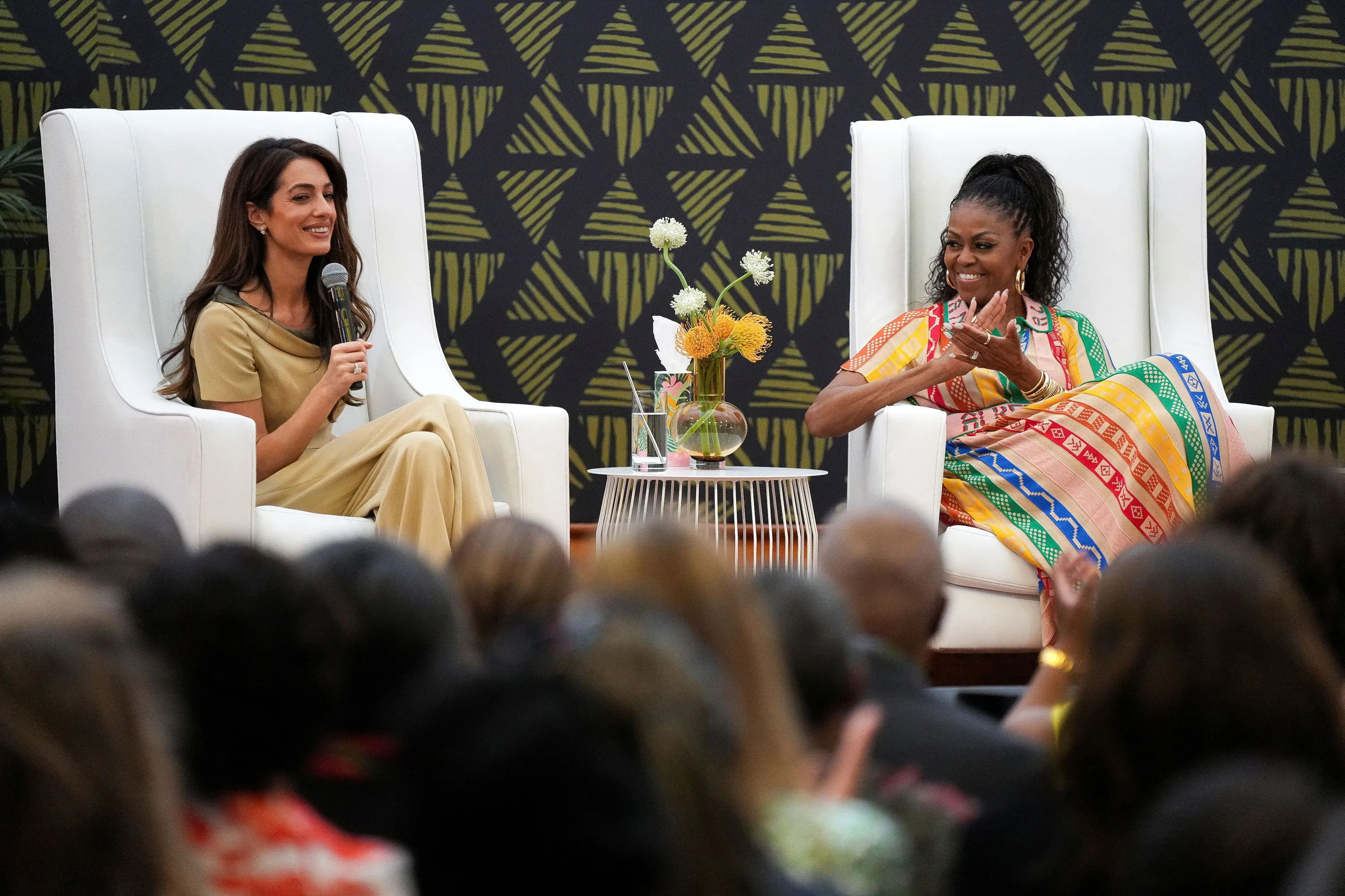 Leading human rights lawyer Amal Clooney speaks next to former U.S. first lady Michelle Obama during the Discussion on Ending Child Marriage and Empowering Adolescent Girls at the Centre for the Book in Cape Town, South Africa on November 16, 2023. (Photo by Nic Bothma/Reuters)