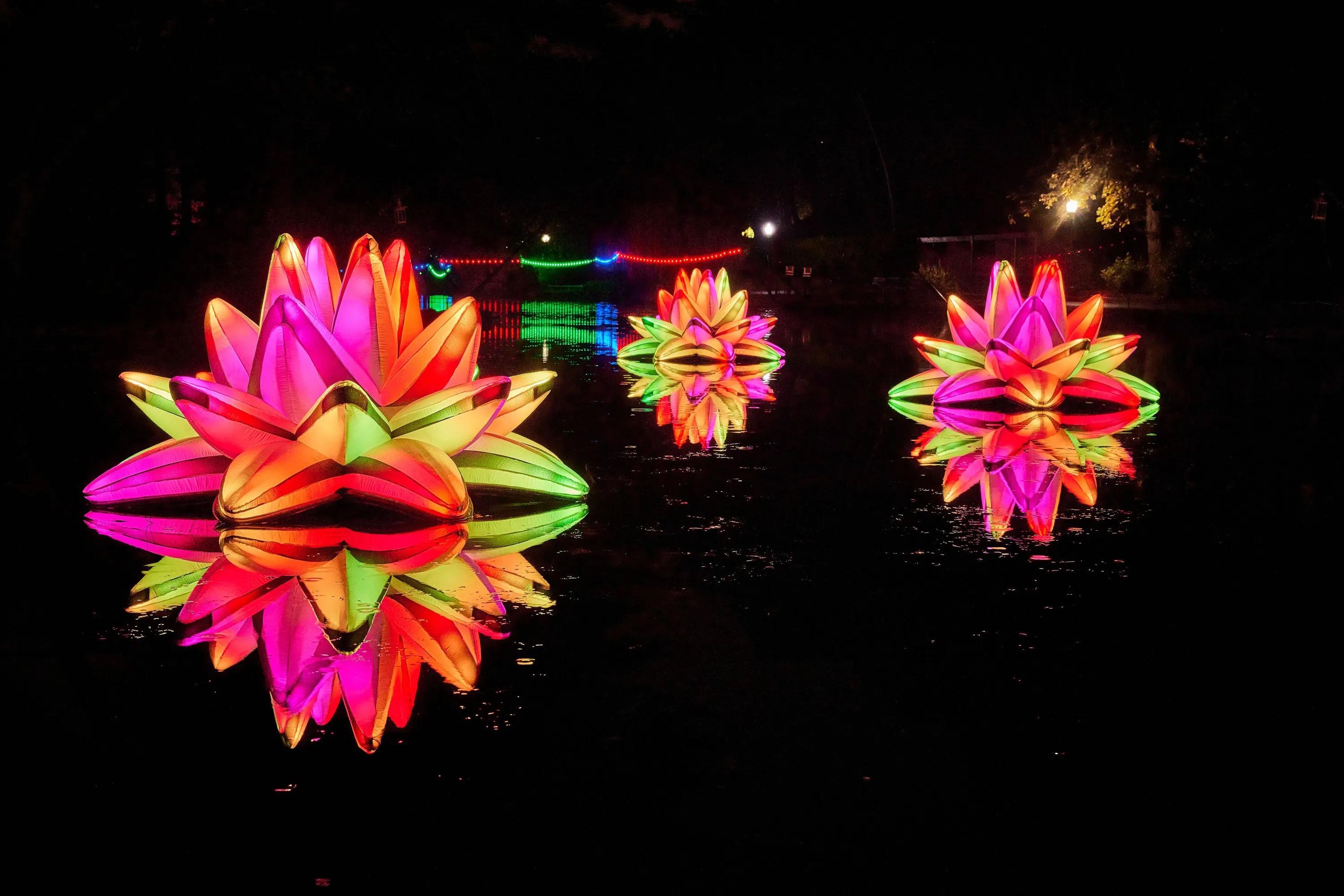 The installation Lillies by the Hungarian artists Réka Magyar and Péter Koros glows at Peasholm Park in Scarborough, UK as part of the North Yorkshire town’s lights festival on November 14, 2023. (Photo by Christopher Thomond/The Guardian)