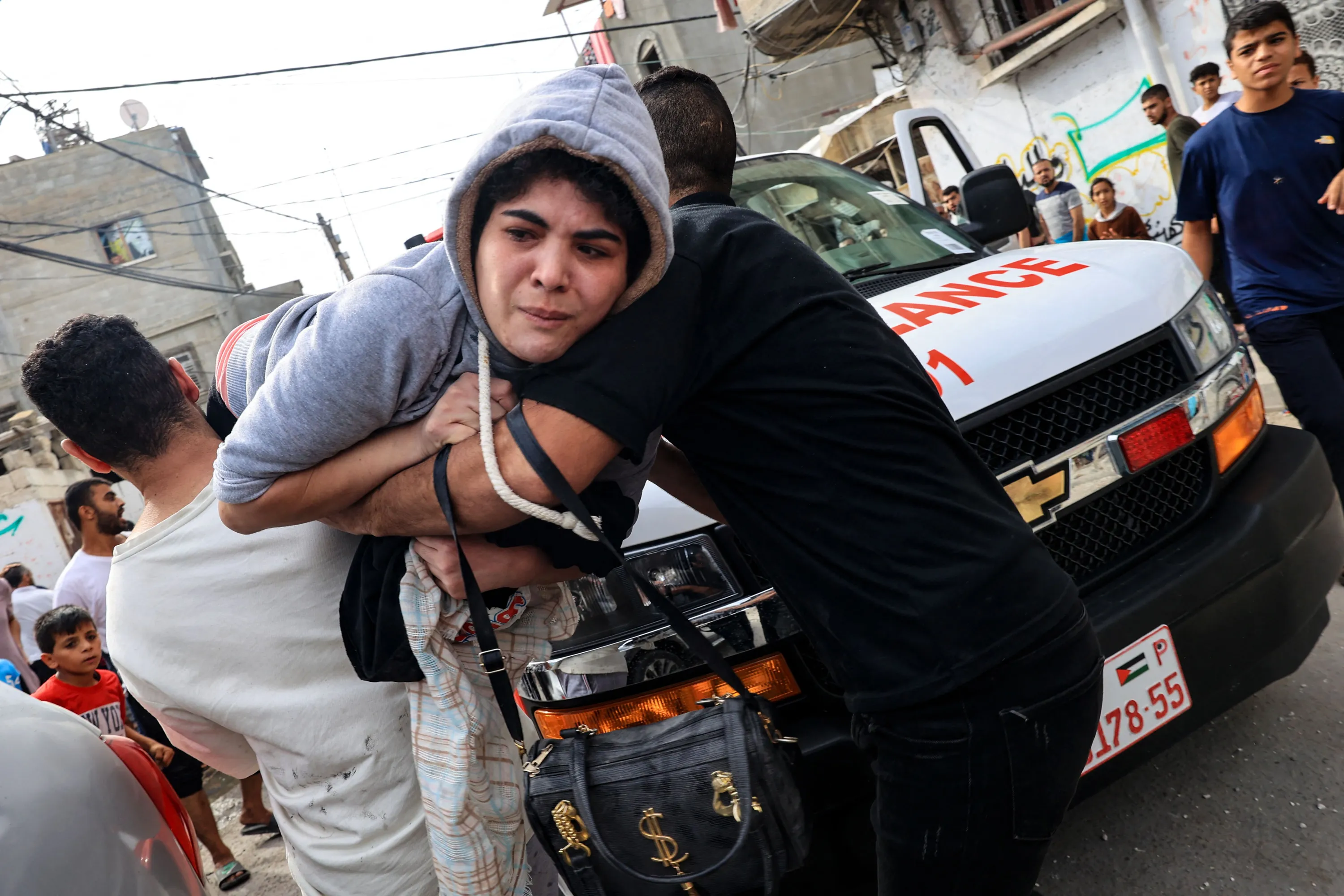 People carry away an injured woman following Israeli bombing on Rafah in the southern Gaza Strip, on November 11, 2023, as battles between Israel and the Palestinian Hamas movement continue. (Photo by Said Khatib/AFP Photo)
