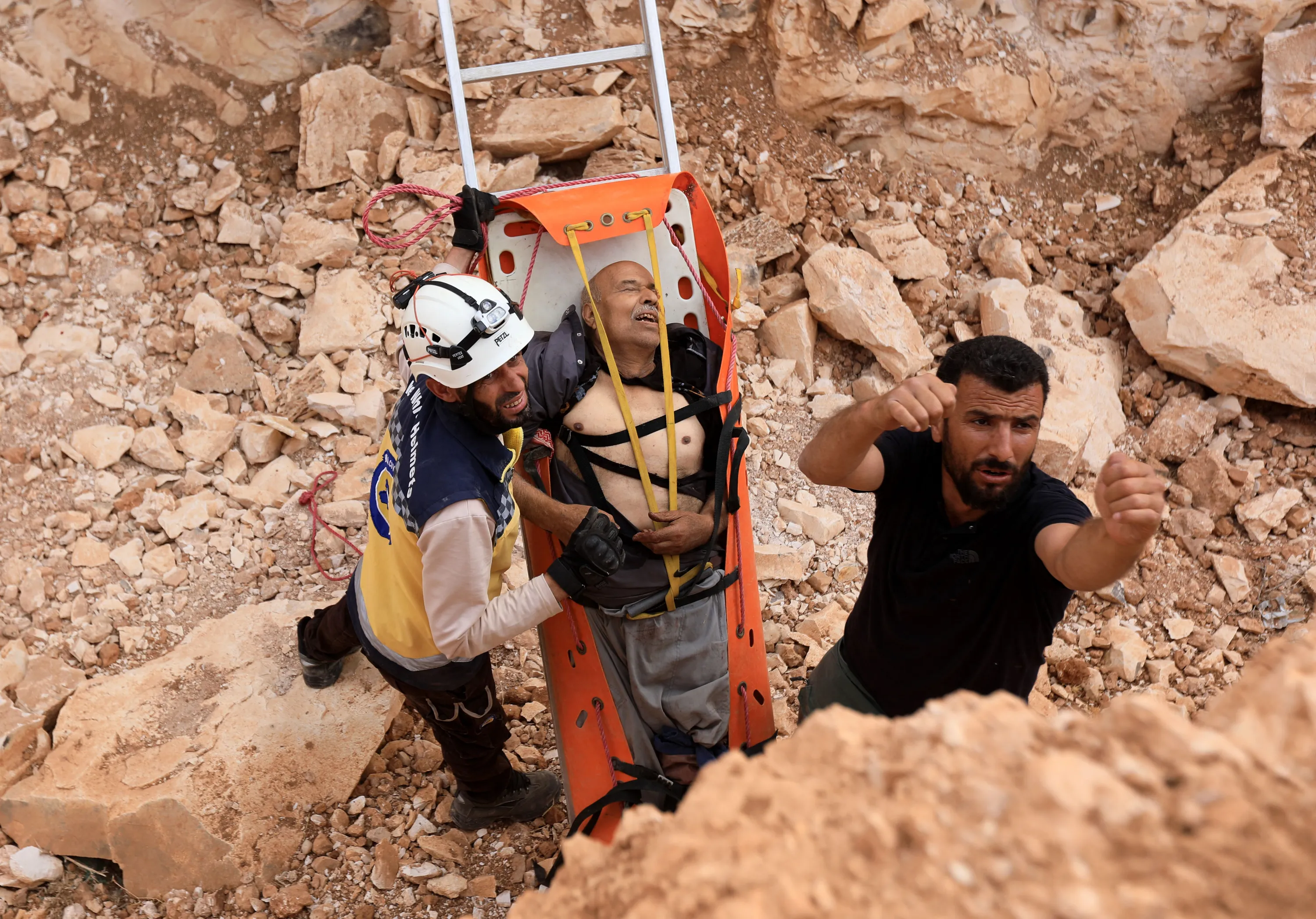 Members of the Syrian civil defence, known as the White Helmets, evacuate a wounded man from the site after a landmine reportedly exploded under the bus transporting them east of the opposition-held city of Al-Bab in the northern Aleppo province, on September 23, 2022. (Photo by Bakr Alkasem/AFP Photo)