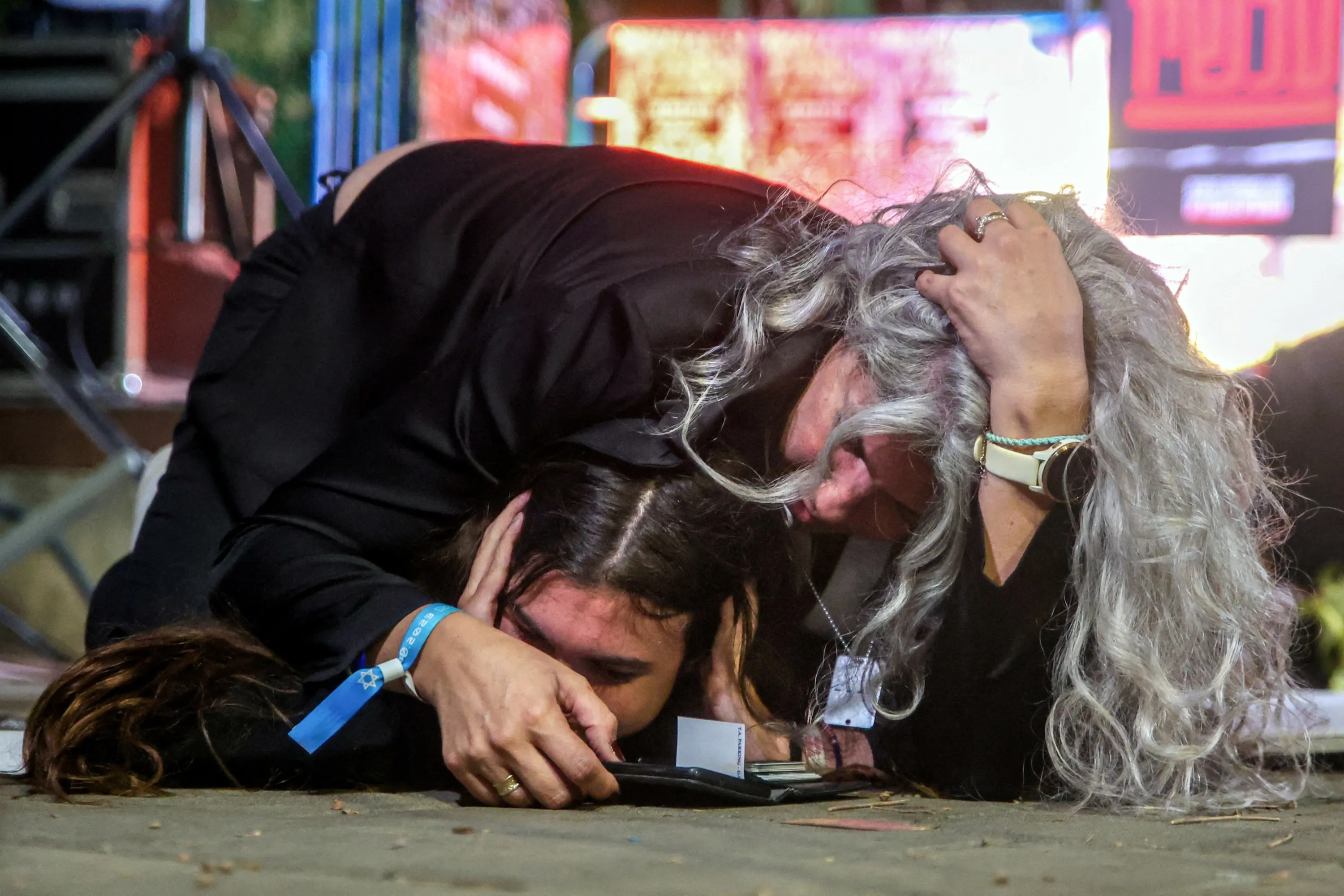 A mother covers her daughter as a siren sounds signalling incoming rockets launched from the Gaza Strip towards Israel during a protest calling on the UN and UNICEF to assist children being held hostage in Gaza by Hamas, near the offices of UNICEF in Tel Aviv, Israel on November 20, 2023. (Photo by Itai Ron/Reuters)