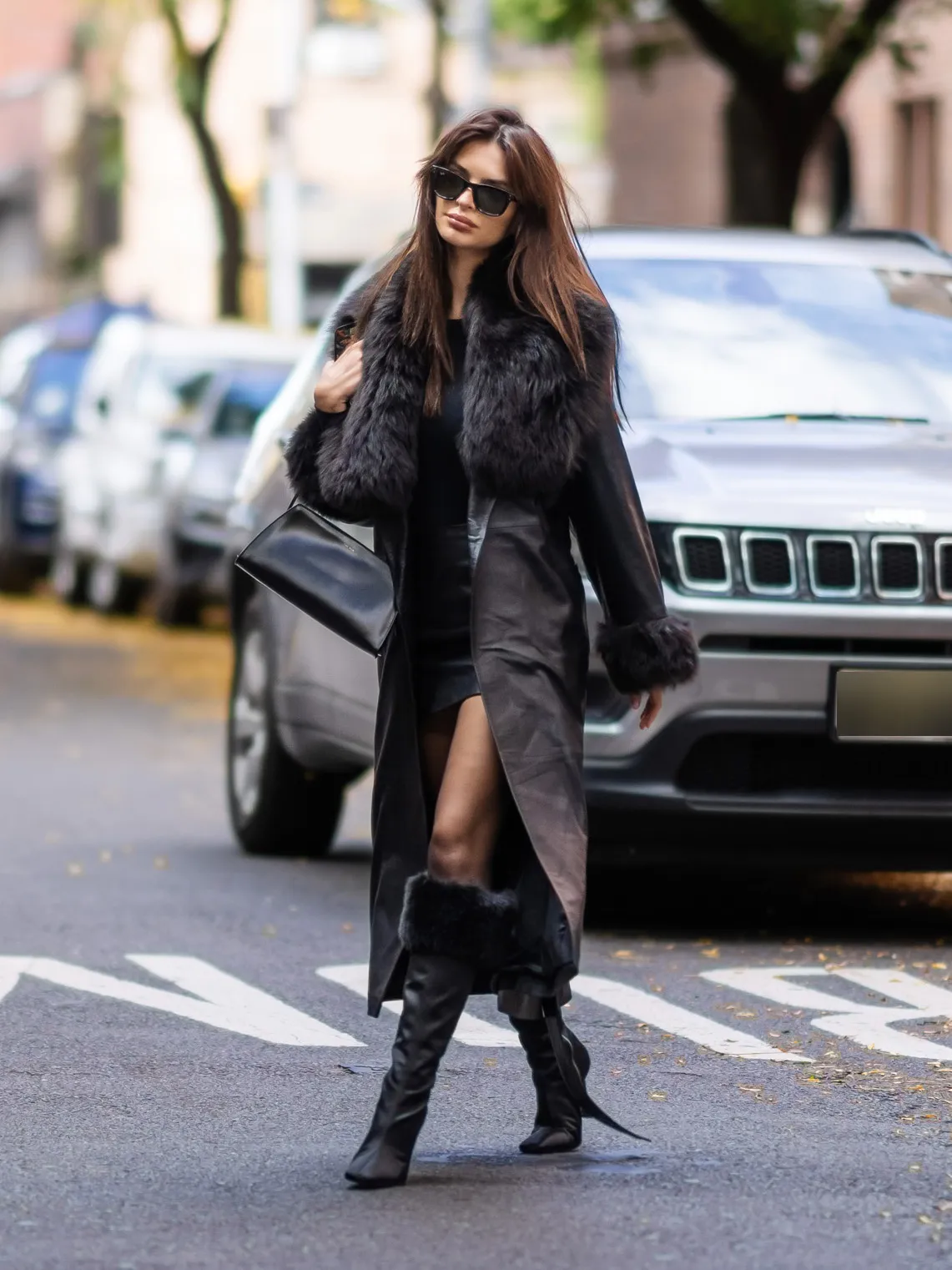 Emily Ratajkowski looks fashionable stepping out in New York City on October 31, 2023. The American supermodel wore a faux fur trimmed trench coat, black blouse, matching leather mini skirt, and knee high boots. (Photo by The Image Direct)