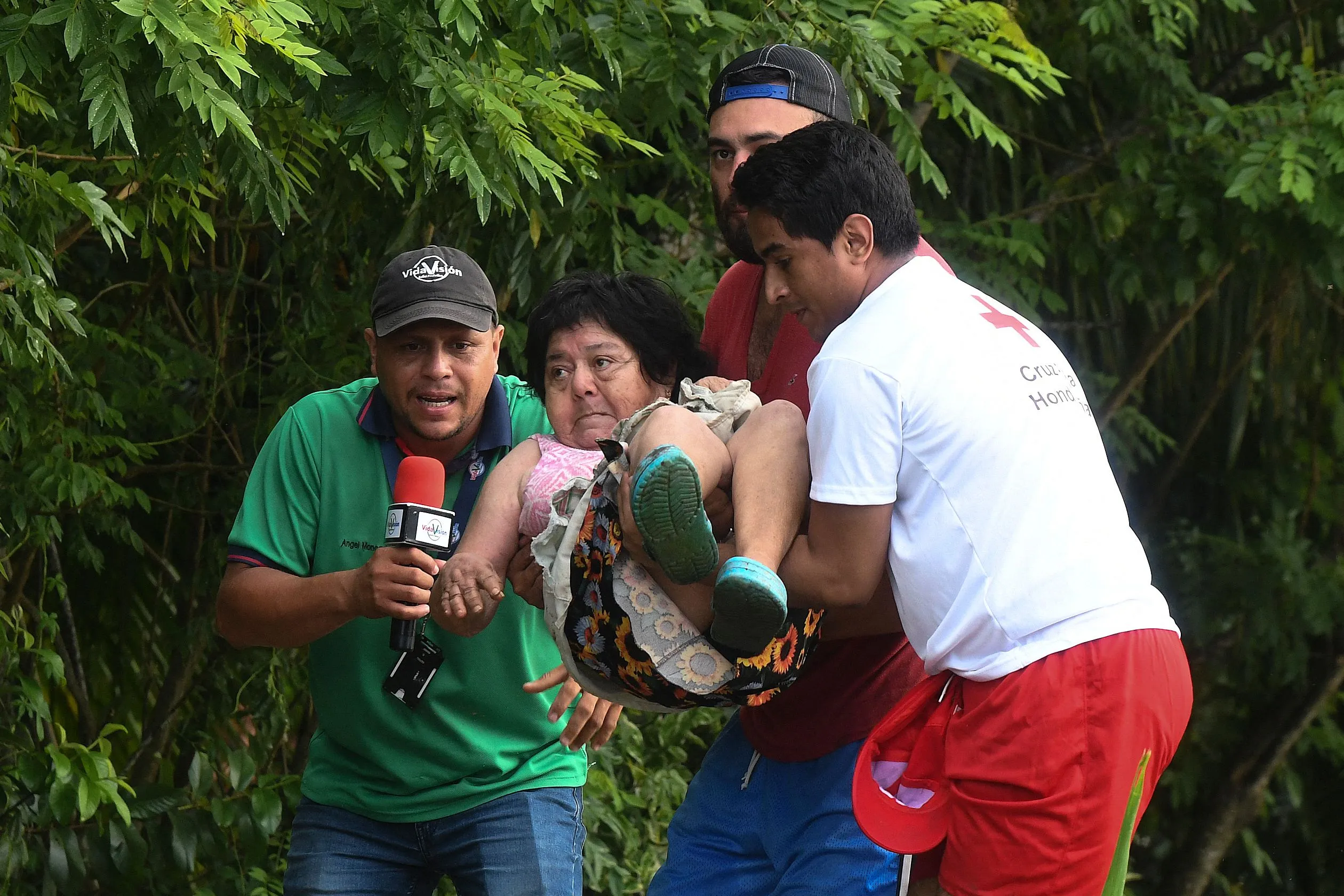 A member of the Honduran red cross rescues an elderly woman after the overflow of the Ulua river in El Progreso, Honduras, on September 24, 2022. Honduras declared a red alert in the northwestern region of the country due to the scourge of torrential rains that caused the overflow of rivers, leaving at least 13 dead during the last week and more than 200 houses destroyed by landslides in the Honduran capital. (Photo by Orlando Sierra/AFP Photo)