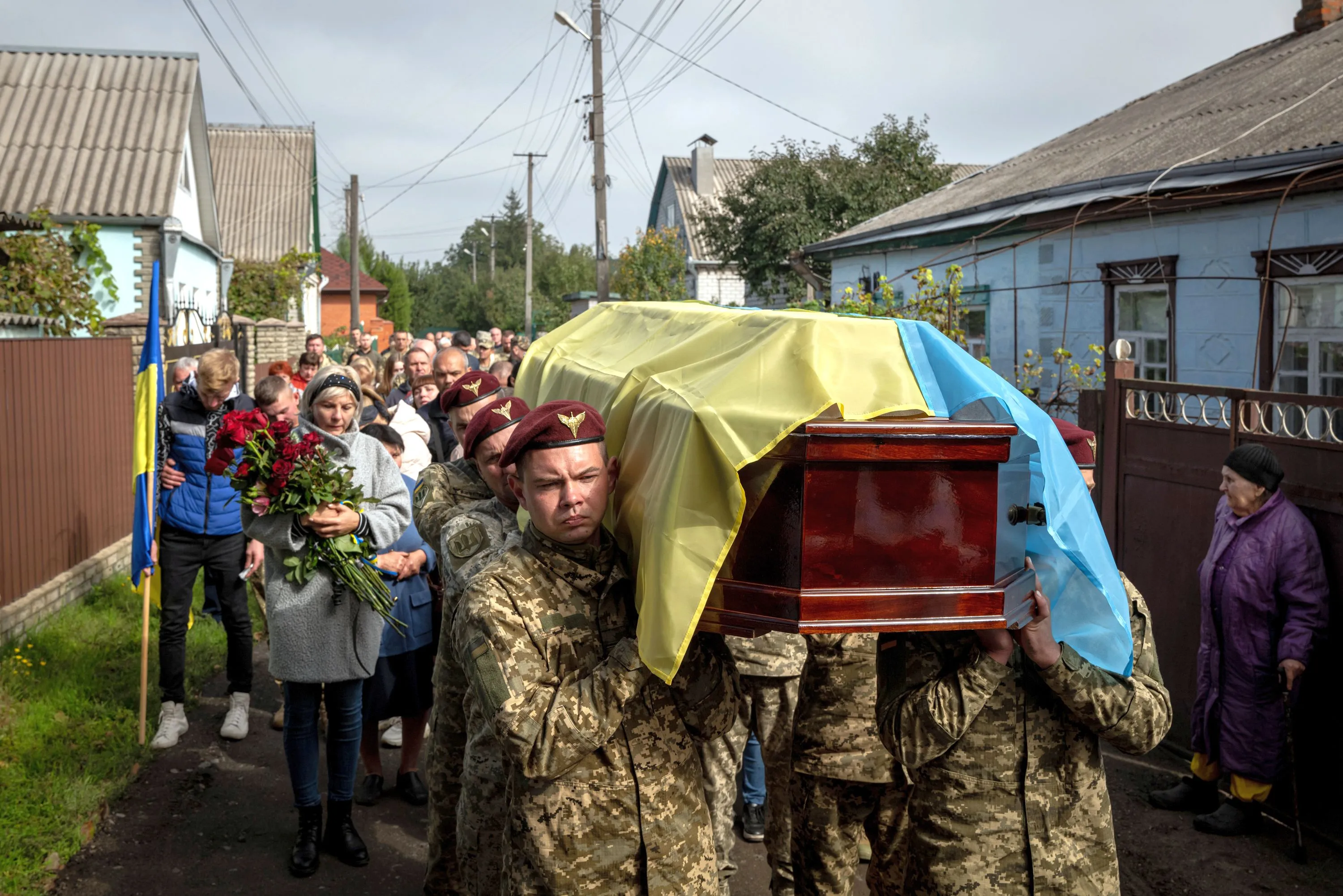 The funeral procession for Chief Sergeant Serhiy Grymaylo, 30, in Novomoskovsk, Ukraine, on Thursday, September 29, 2022. Grymaylo was killed in the Donetsk region on September 23, 2022. (Photo by Nicole Tung/The New York Times)