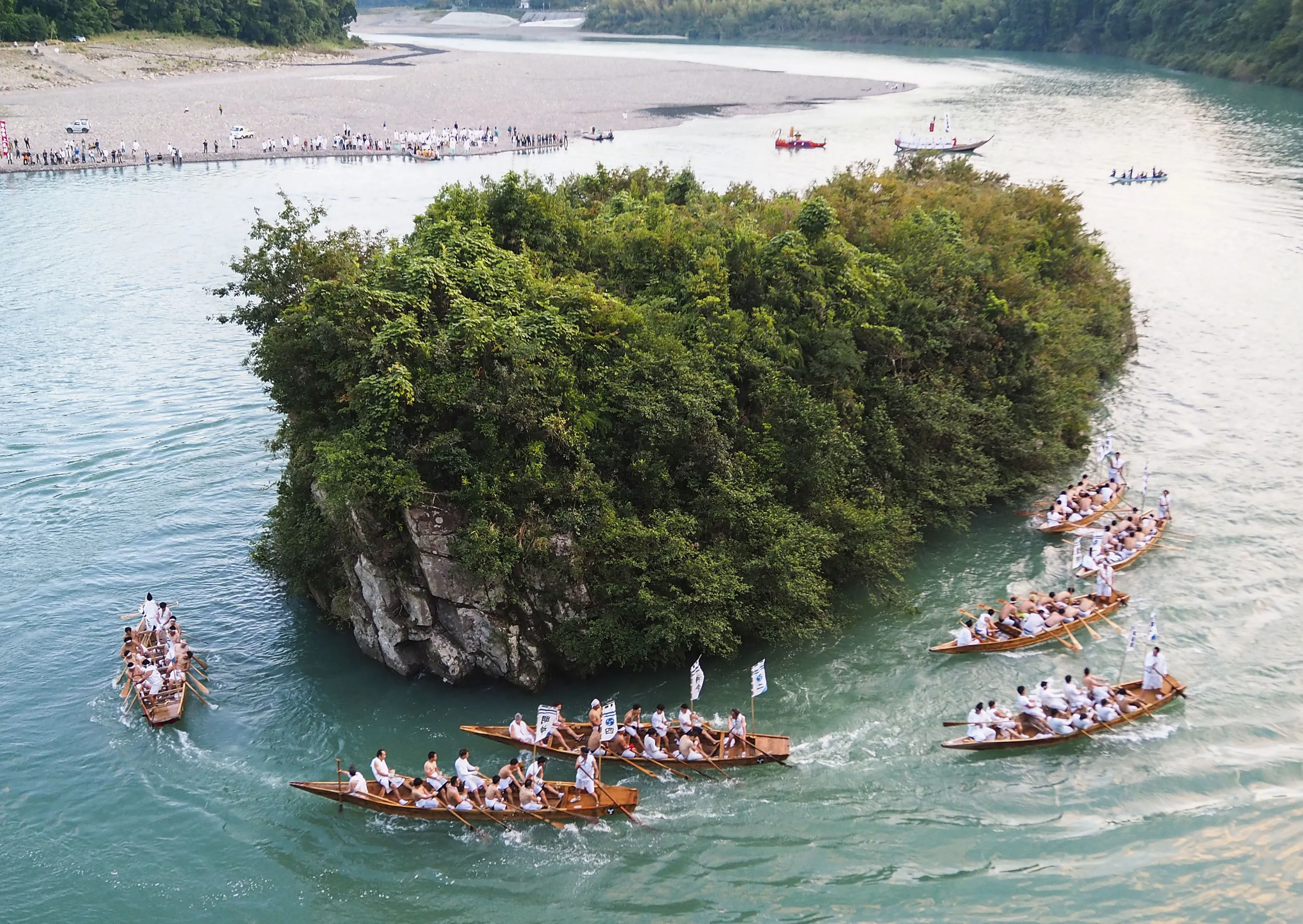 Wooden “speedboats” rowed by shirtless men compete in a traditional boating race as part of the Mifune festival on the Kumano River running near World Heritage-listed Kumano Hayatama Taisha Grand Shrine in Shingu in the western Japan prefecture of Wakayama on October 16, 2023. (Photo by Kyodo News/Newscom via Avalon)