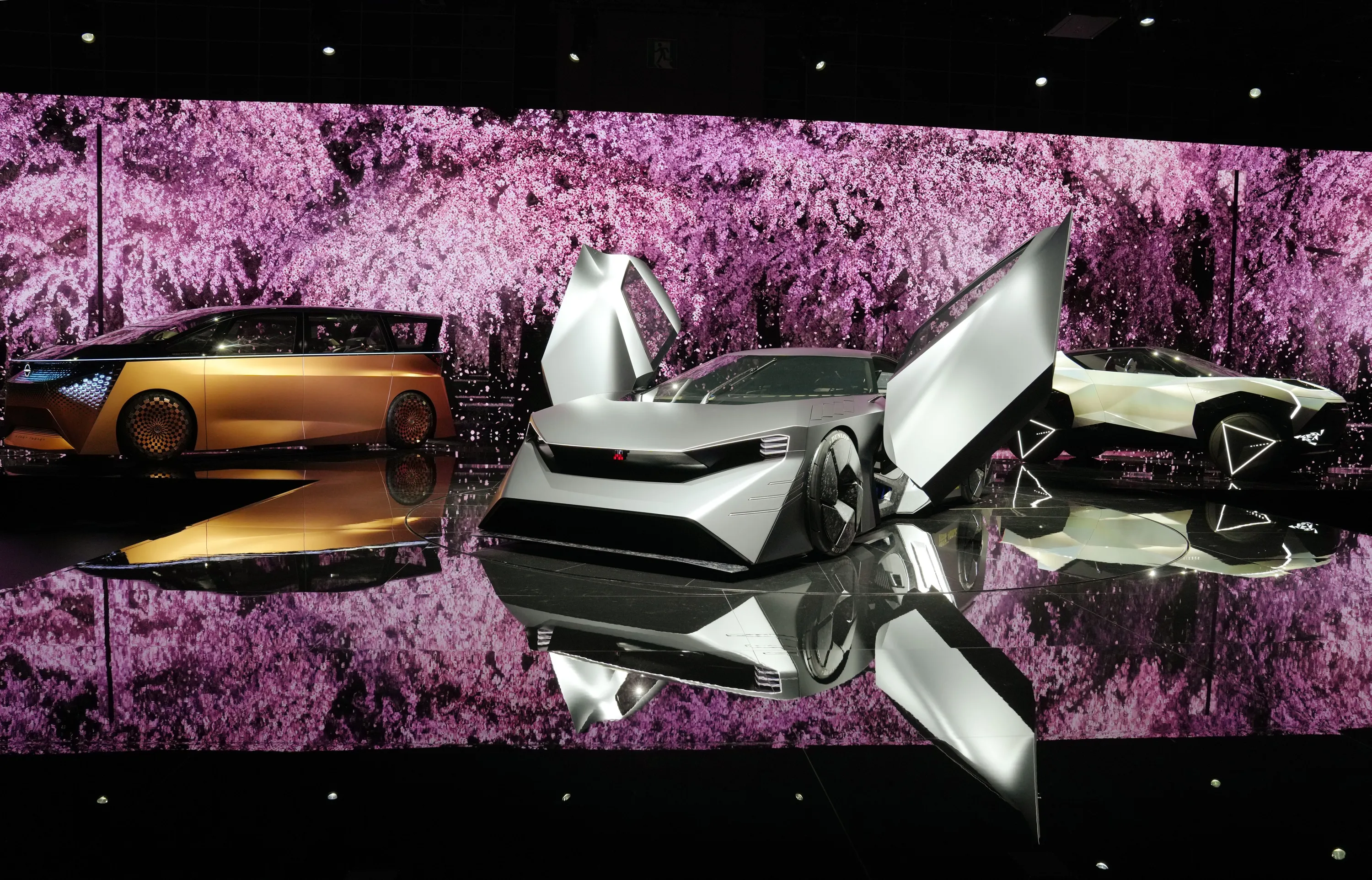 Japanese carmaker Nissan Motor Co. Ltd., unveils its Nissan Hyper EV concept vehicles, the minivan Nissan “Hyper Tourer” (L), Nissan “Hyper Force” (C) and compact crossover Nissan “Hyper Punk” (R), during a presentation at the Japan Mobility Show 2023 in Tokyo, Japan, 25 October 2023. The Japan Mobility Show 2023 will be open to the general public from 28 October to 05 November 2023. (Photo by Kimimasa Mayama/EPA)