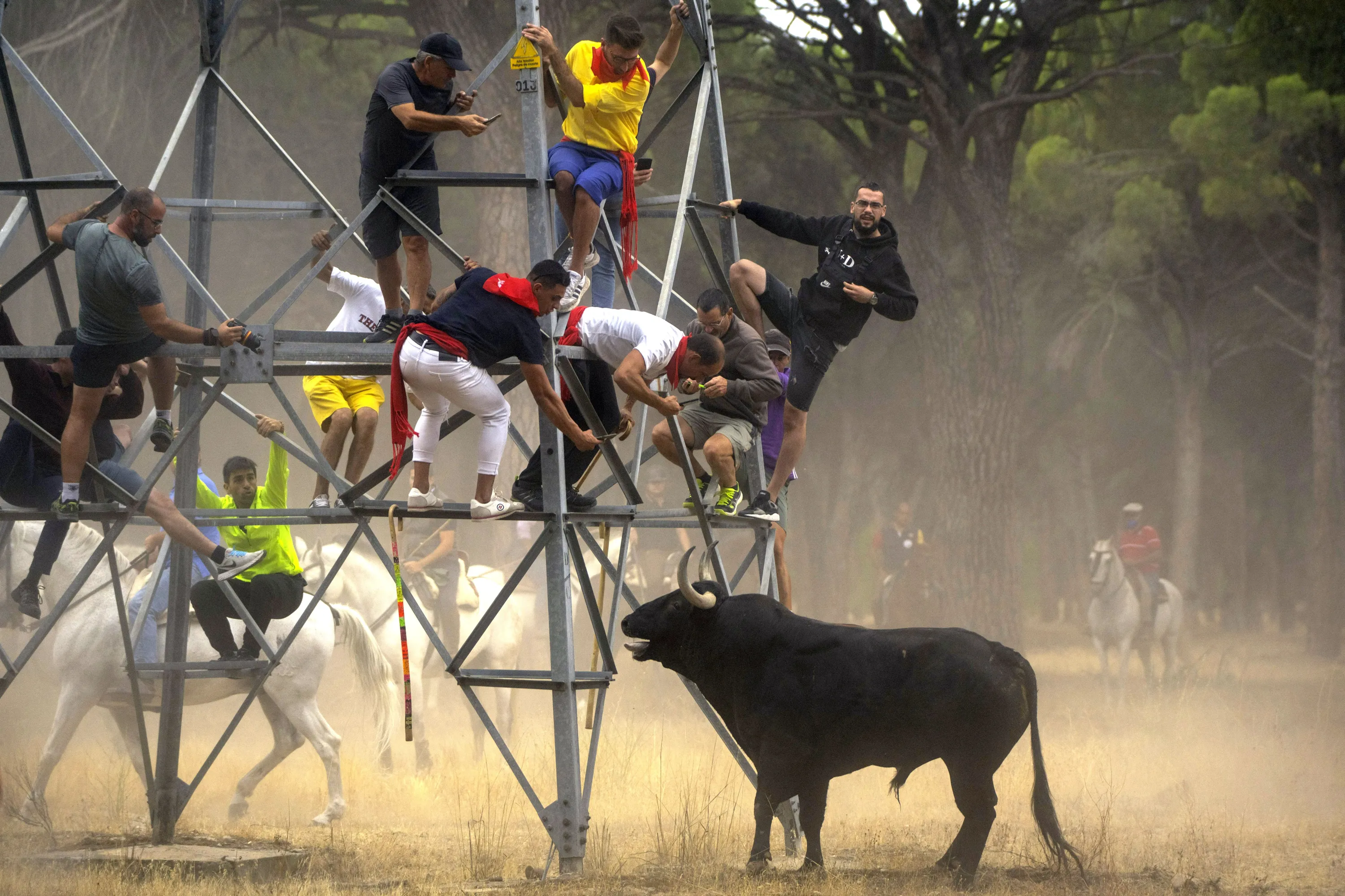 Men escape a bull during the 'Toro de la Vega' bull festival in Tordesillas, near Valladolid, Spain, Tuesday, September 13, 2022. Hundreds of people have taken part in a centuries-old Spanish bull-chasing festival, but under orders once again that the animal should not be harmed with spears or darts. The Toro de La Vega festival in the northcentral town of Tordesillas traditionally saw the bull speared to death by revelers who chased it from the town to outlying fields on horseback and on foot. (Photo by Manu Fernandez/AP Photo)