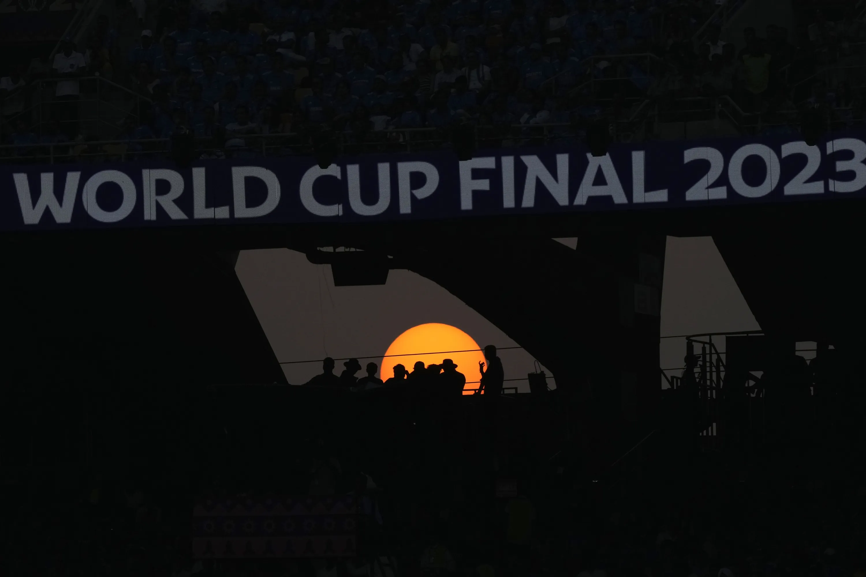 The sun sets over the Narendra Modi stadium during the ICC Men's Cricket World Cup final match between Australia and India in Ahmedabad, India, Sunday, November 19, 2023. (Photo by Mahesh Kumar A./AP Photo)