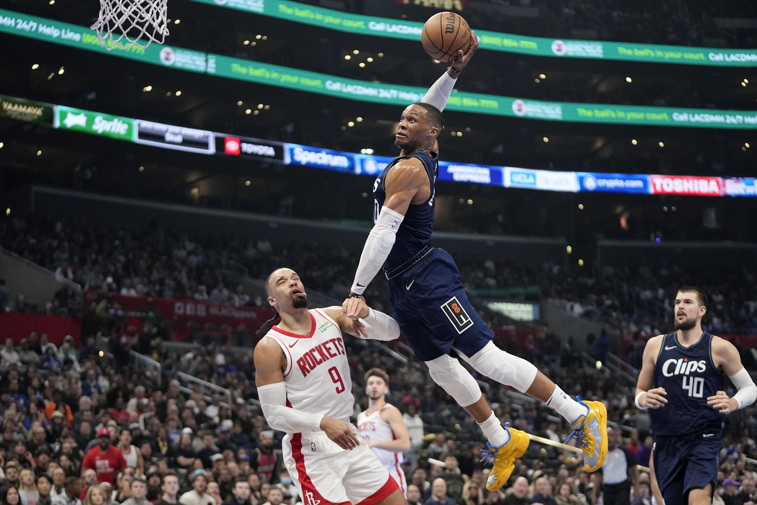 Los Angeles Clippers guard Russell Westbrook, center, attempts a dunk after hitting Houston Rockets forward Dillon Brooks, left, in the face as center Ivica Zubac watches during the first half of an NBA basketball In-Season Tournament game Friday, November 17, 2023, in Los Angeles. Westbrook did not complete the dunk and Brooks was called for a foul on the play. (Photo by Mark J. Terrill/AP Photo)
