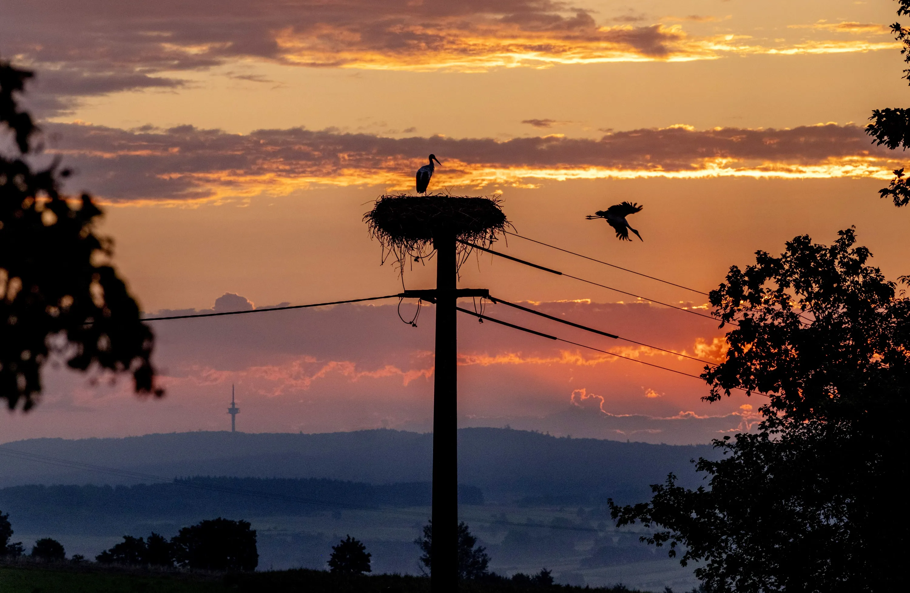 A stork takes off from its nest in New Anspach near Frankfurt, Germany, before sunrise on Sunday, August 20, 2023. (Photo by Michael Probst/AP Photo)