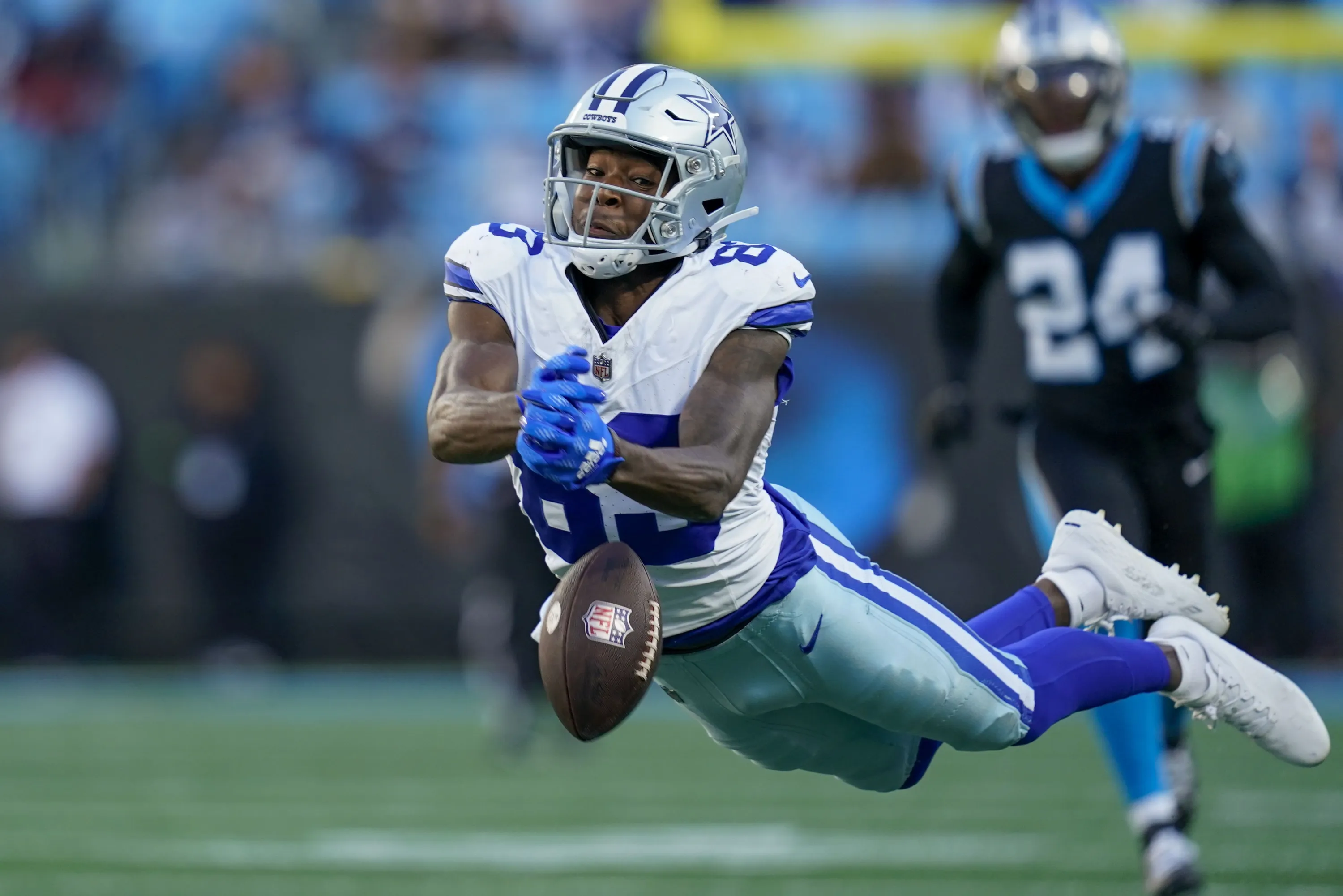 Dallas Cowboys wide receiver Jalen Brooks misses a catch against the Carolina Panthers during the second half of an NFL football game Sunday, November 19, 2023, in Charlotte, N.C. (Photo by Erik Verduzco/AP Photo)