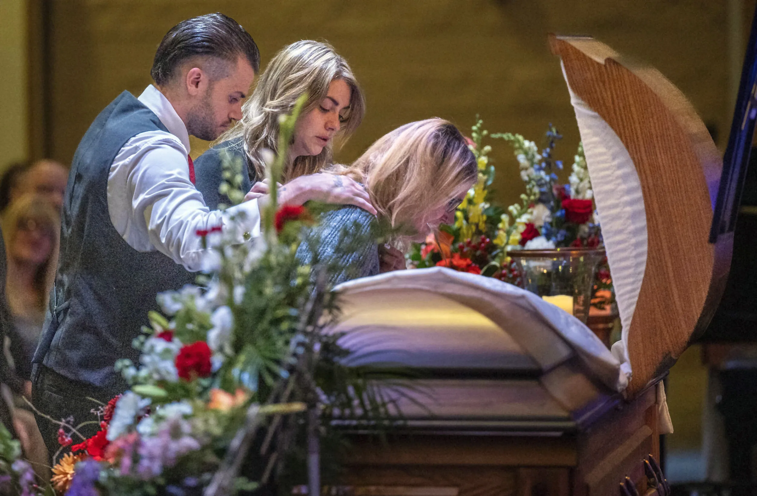 Tracey Walker leans into the coffin of her husband, Joe Walker, who was killed at Schmengees Bar and Grill in the mass shooting Friday, November 17, 2023 in Auburn, Maine. Joe's children, Brandon and Bethany Welsh stand with her in support at the funeral at the East Auburn Baptist Church. (Photob by Andree Kehn/Sun Journal via AP Photo)