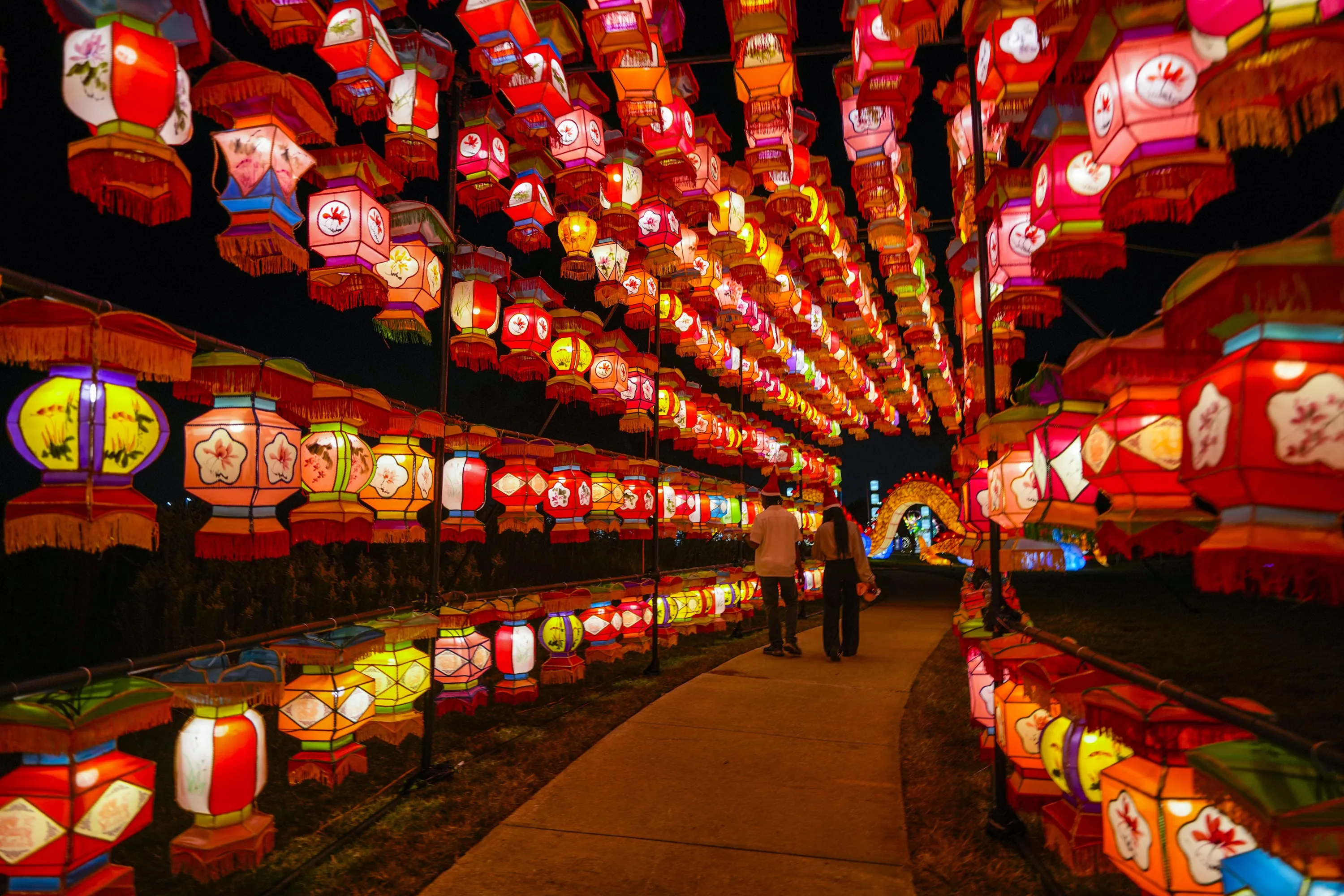 A walkway of Chinese lanterns illuminate a walkway during the new holiday light show, Radiant Nature at the Houston Botanic Garden, Saturday, November 18, 2023, in Houston. Radiant Nature is inspired by traditional Chinese lantern designs. (Photo by Karen Warren/Houston Chronicle via AP Photo)