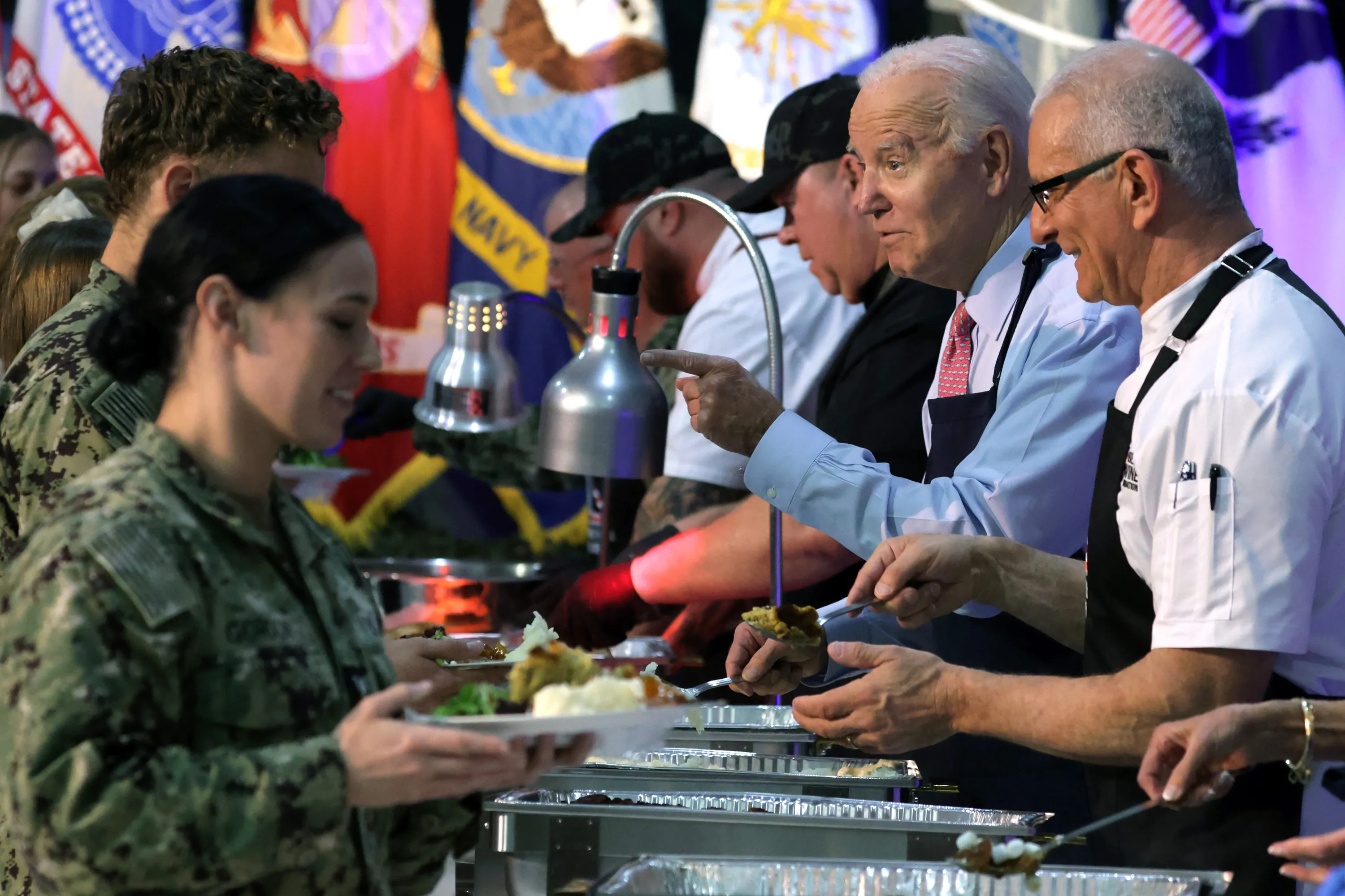 U.S. President Joe Biden serves service members and military families from the USS Dwight D. Eisenhower and the USS Gerald R. Ford during a Friendsgiving dinner event at the Norfolk Naval Station on November 19, 2023 in Norfolk, Virginia. Co-hosted by the USO and Robert Irvine Foundation, President Biden and the first lady host Naval families prior to the Thanksgiving holiday. (Photo by Alex Wong/Getty Images)