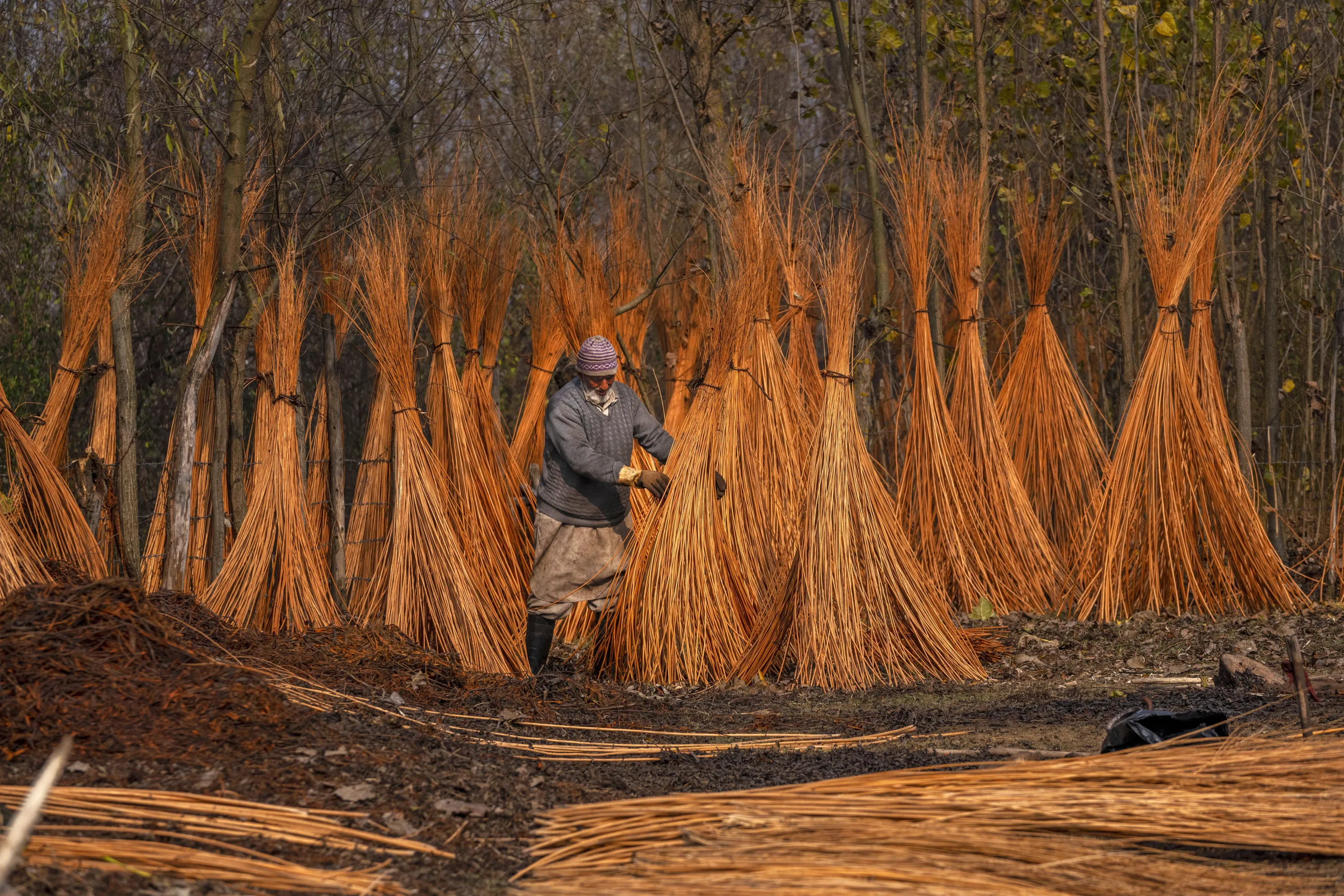 A Kashmiri villager inspects wicker sticks left for drying after peeling the cover on the outskirts of Srinagar, Indian controlled Kashmir, Thursday, November 16, 2023. (Photo by Dar Yasin/AP Photo)