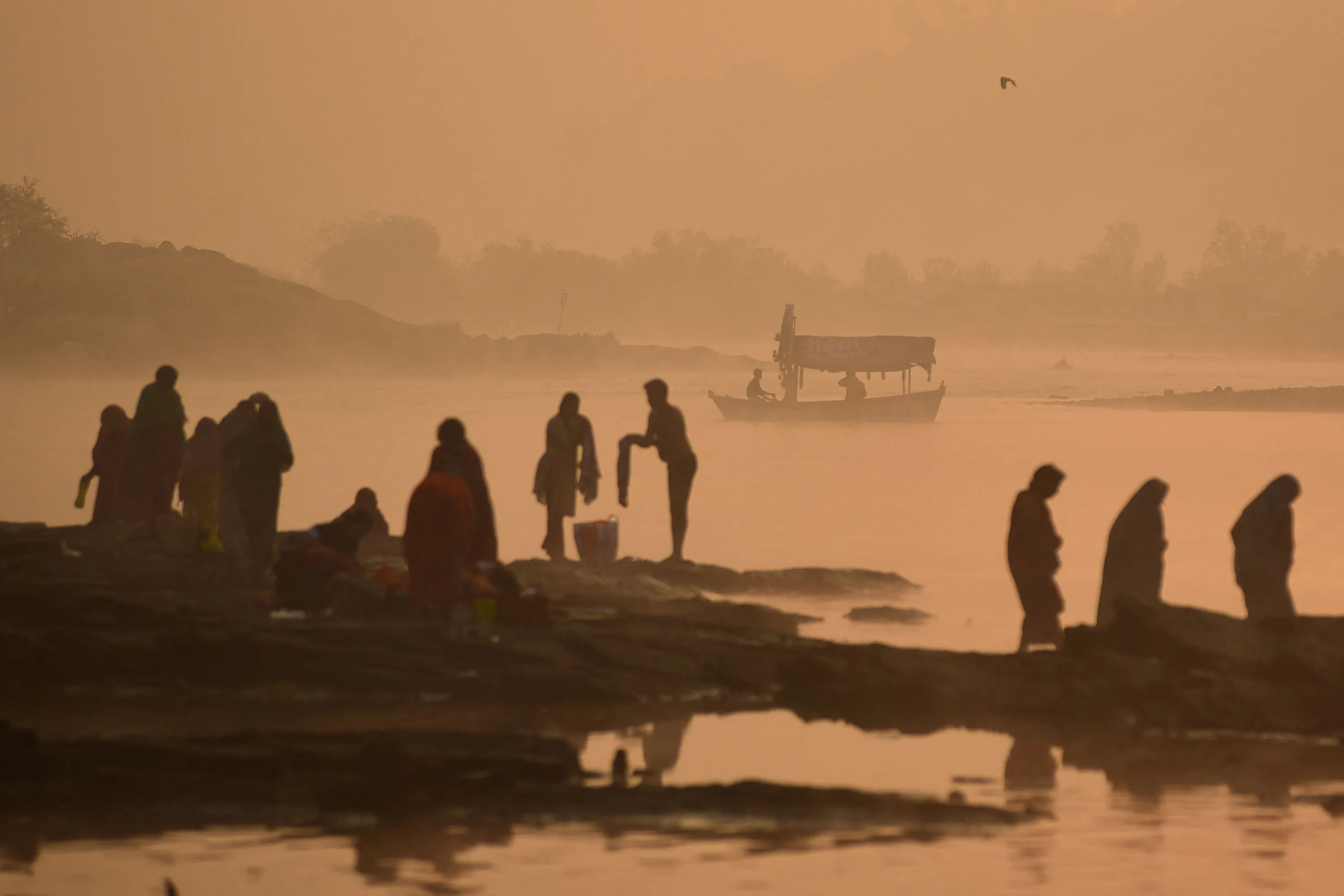 A boatman steers his boat as people stand on the banks on the Narmada River on foggy morning in Jabalpur on November 18, 2023. (Photo by Uma Shankar Mishra/AFP Photo)