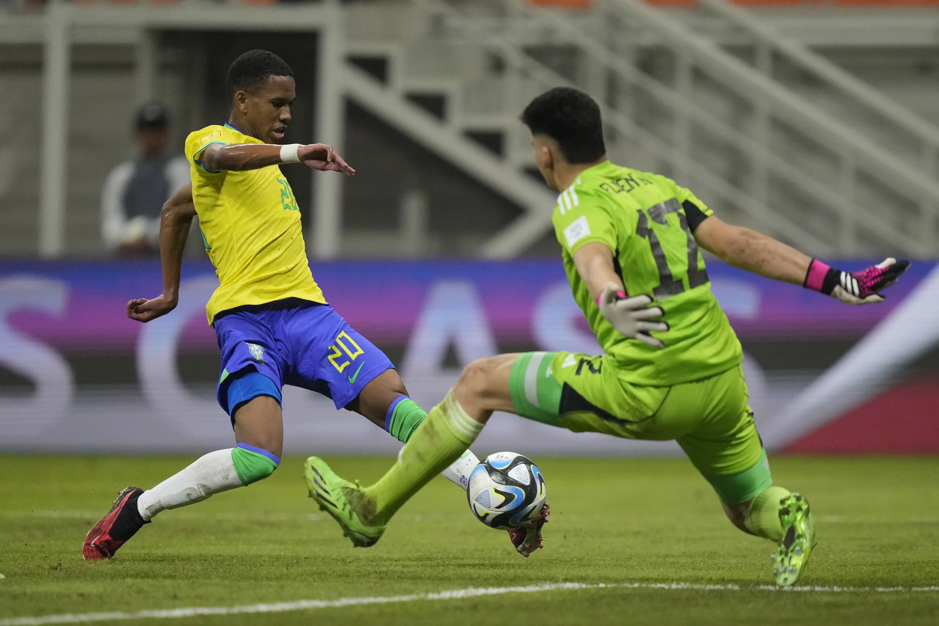 Brazil's Estevao, left, battles for the ball against Argentina's goalkeeper Jeremias Florentin during their FIFA U-17 World Cup quarterfinal soccer match at Jakarta international Stadium in Jakarta, Indonesia, Friday, November 24, 2023. (Photo by Achmad Ibrahim/AP Photo)