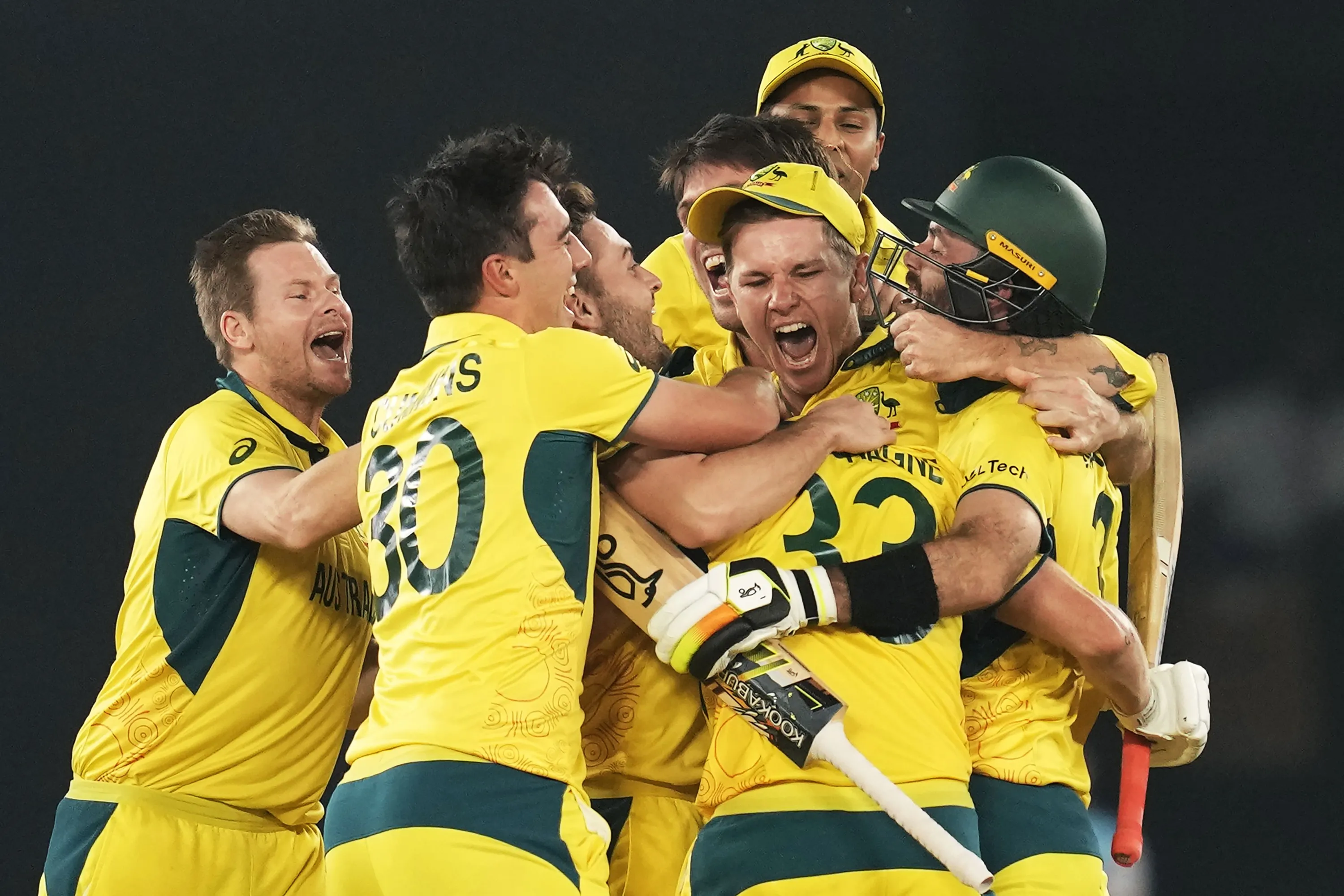 Australia players celebrate after winning the ICC Men's Cricket World Cup final match against India in Ahmedabad, India, Sunday, November 19, 2023. (Photo by Rafiq Maqbool/AP Photo)