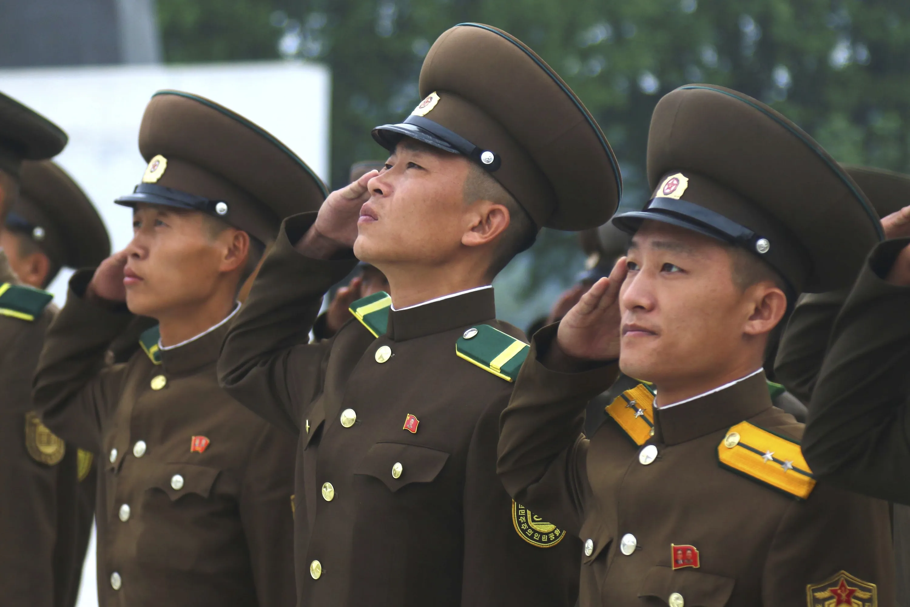 Soldiers of Korean People's Internal Security Forces pay tribute to the statues of former leaders Kim Il Sung and Kim Jong Il on Mansu Hill in Pyongyang, marking North Korea’s 75th founding anniversary, on Saturday, September 9, 2023. (Photo by Cha Song Ho/AP Photo)