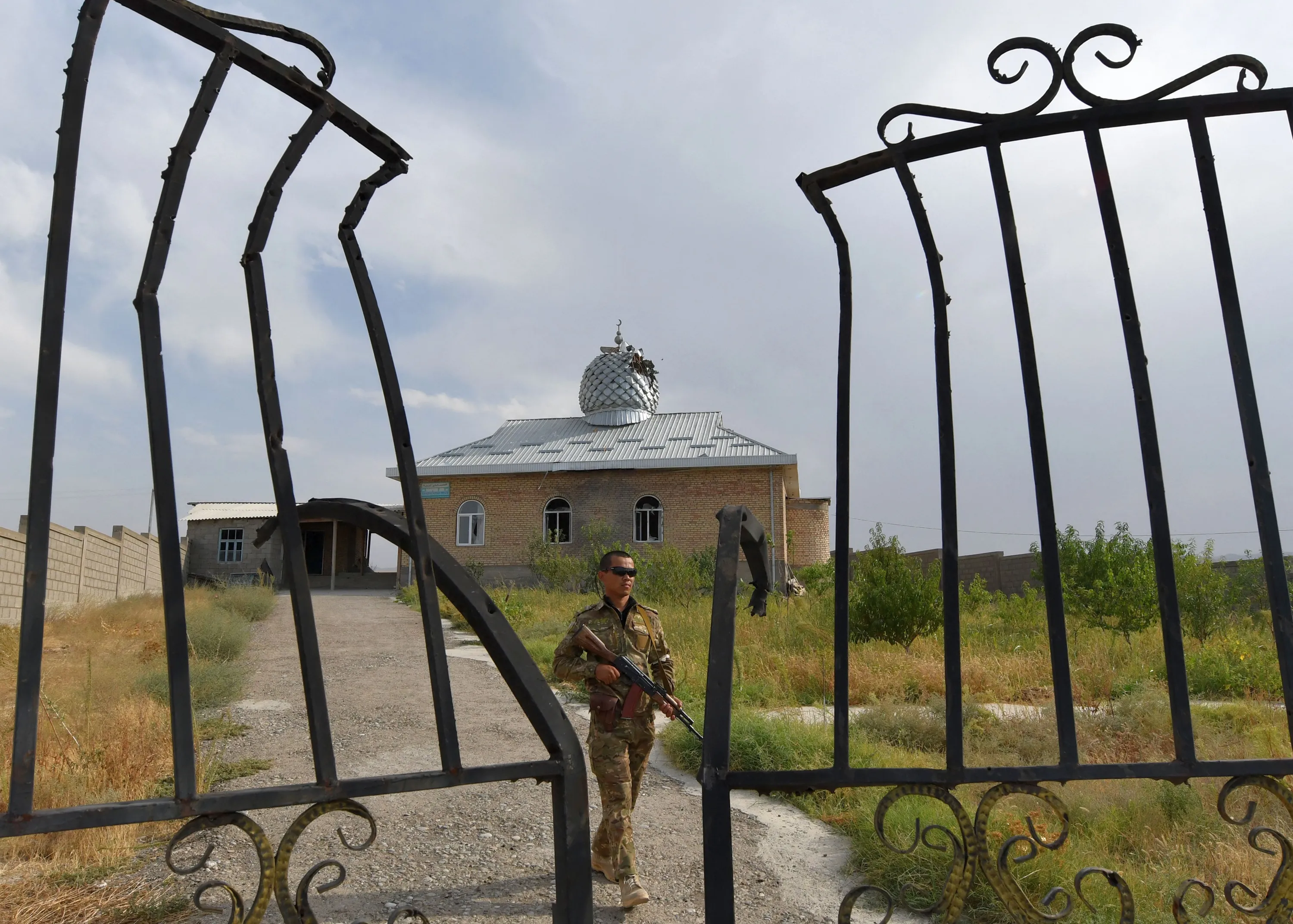 A Kyrgyz soldier patrols near a damaged mosque in the village of Maksat near the Kyrgyz-Tajik border, some 1200 kilometres from Bishkek, on September 20, 2022, as the worst violence the two ex-Soviet countries have seen in years broke out last week on their contested border, raising fears of a large-scale conflict. (Photo by Vyacheslav Oseledko/AFP Photo)
