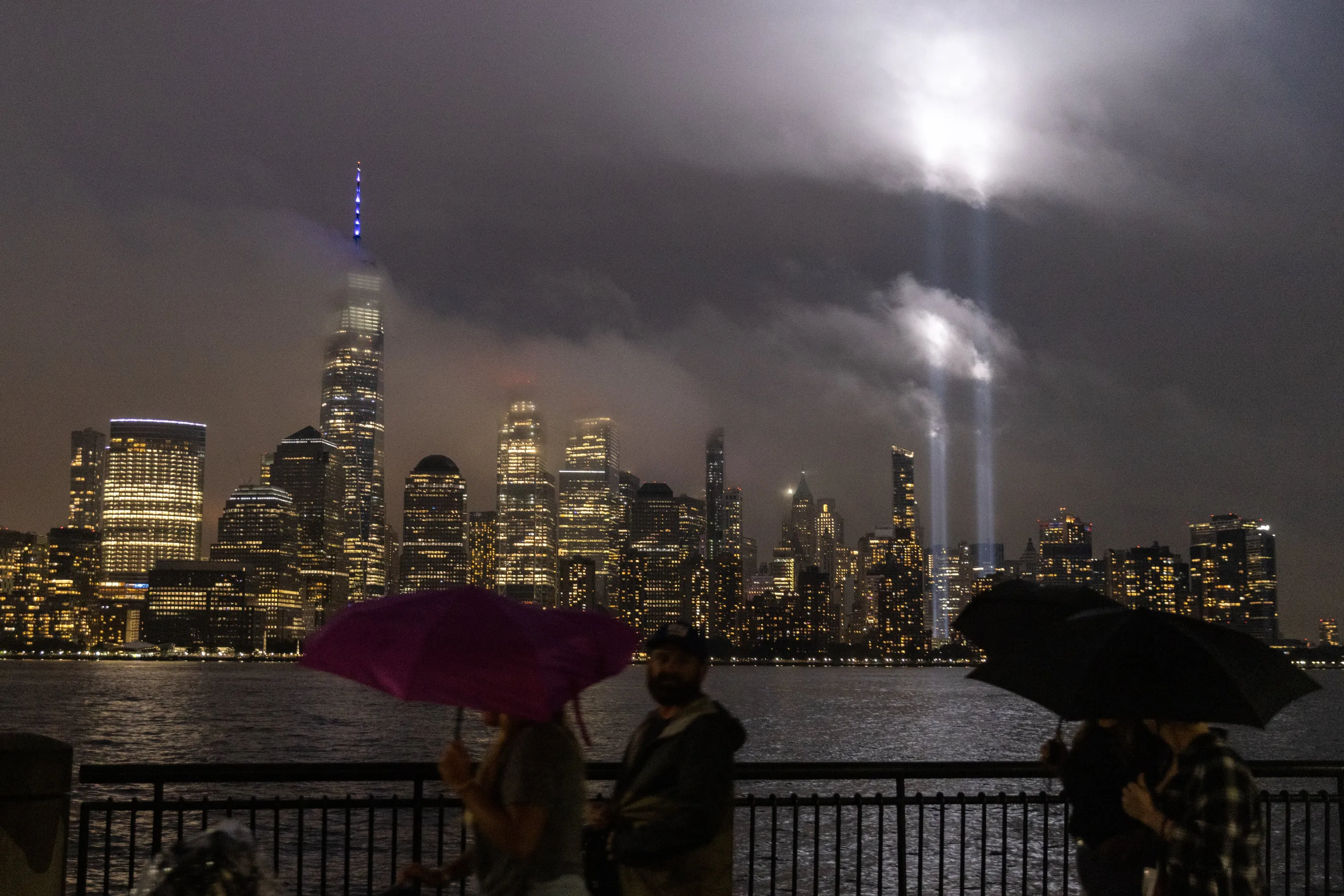 People watch the Tribute in Light art installation and the One World Trade Center in New York City on the day marking the 21st anniversary of the 9/11 attacks from Exchange Place on September 11, 2022 in Jersey City, New Jersey. (Photo by Jeenah Moon/Getty Images)
